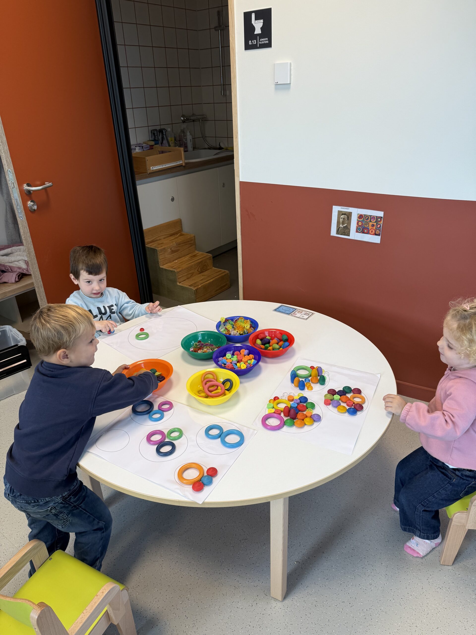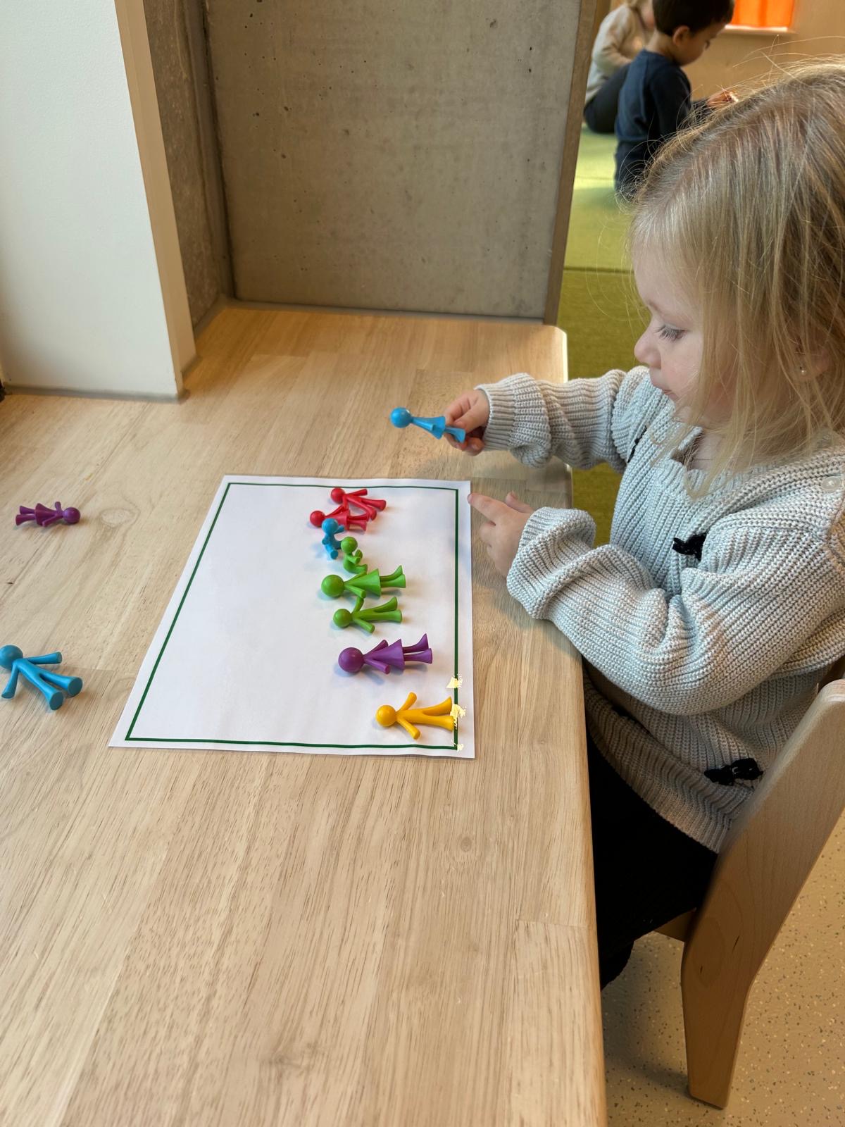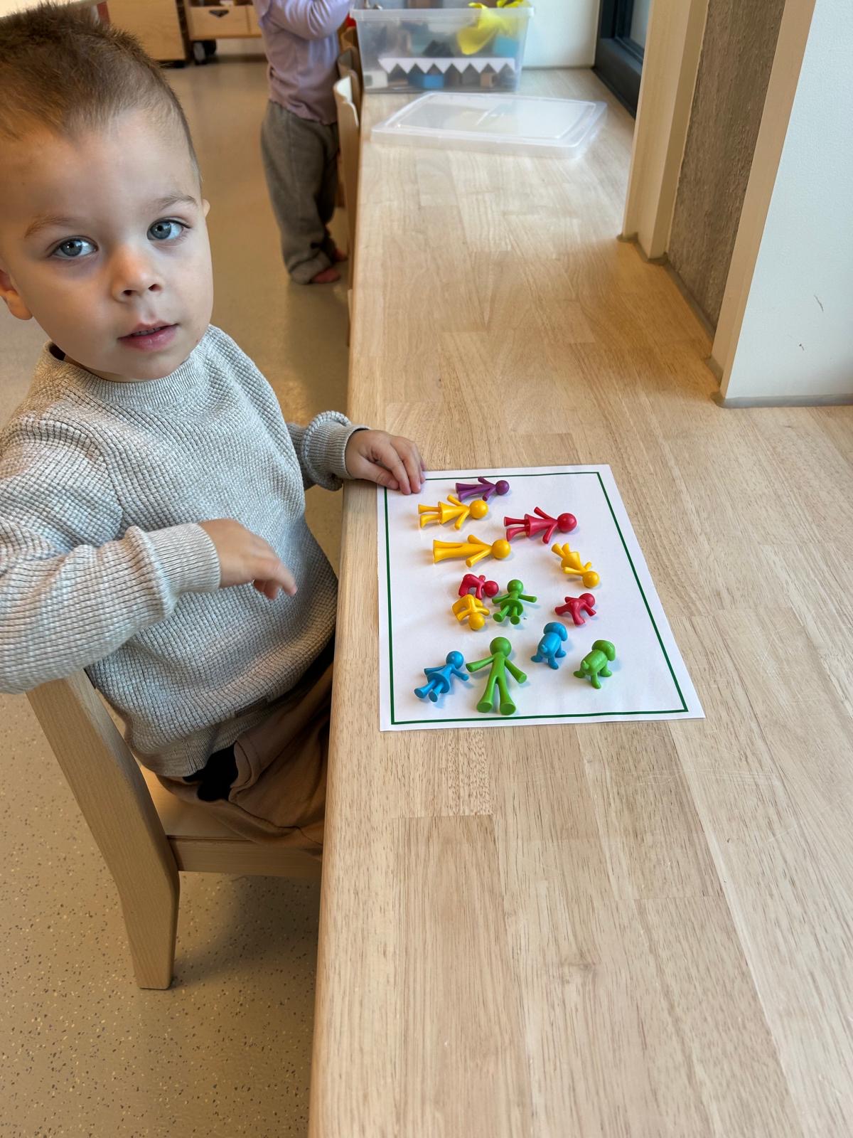 Aan de wiskundetafel oefenden we verder het tellen tot 3 en legden we de 1/1 relatie.