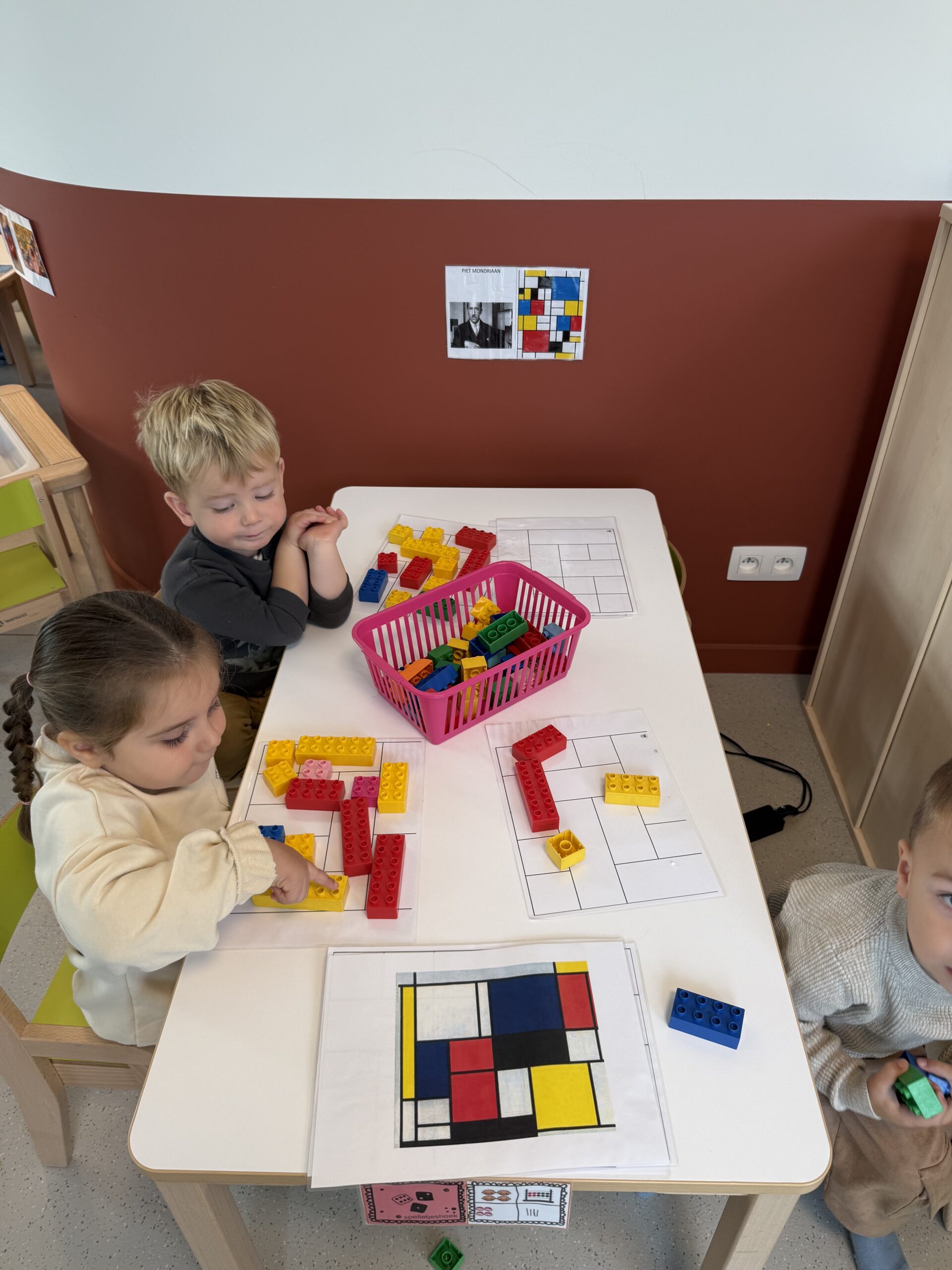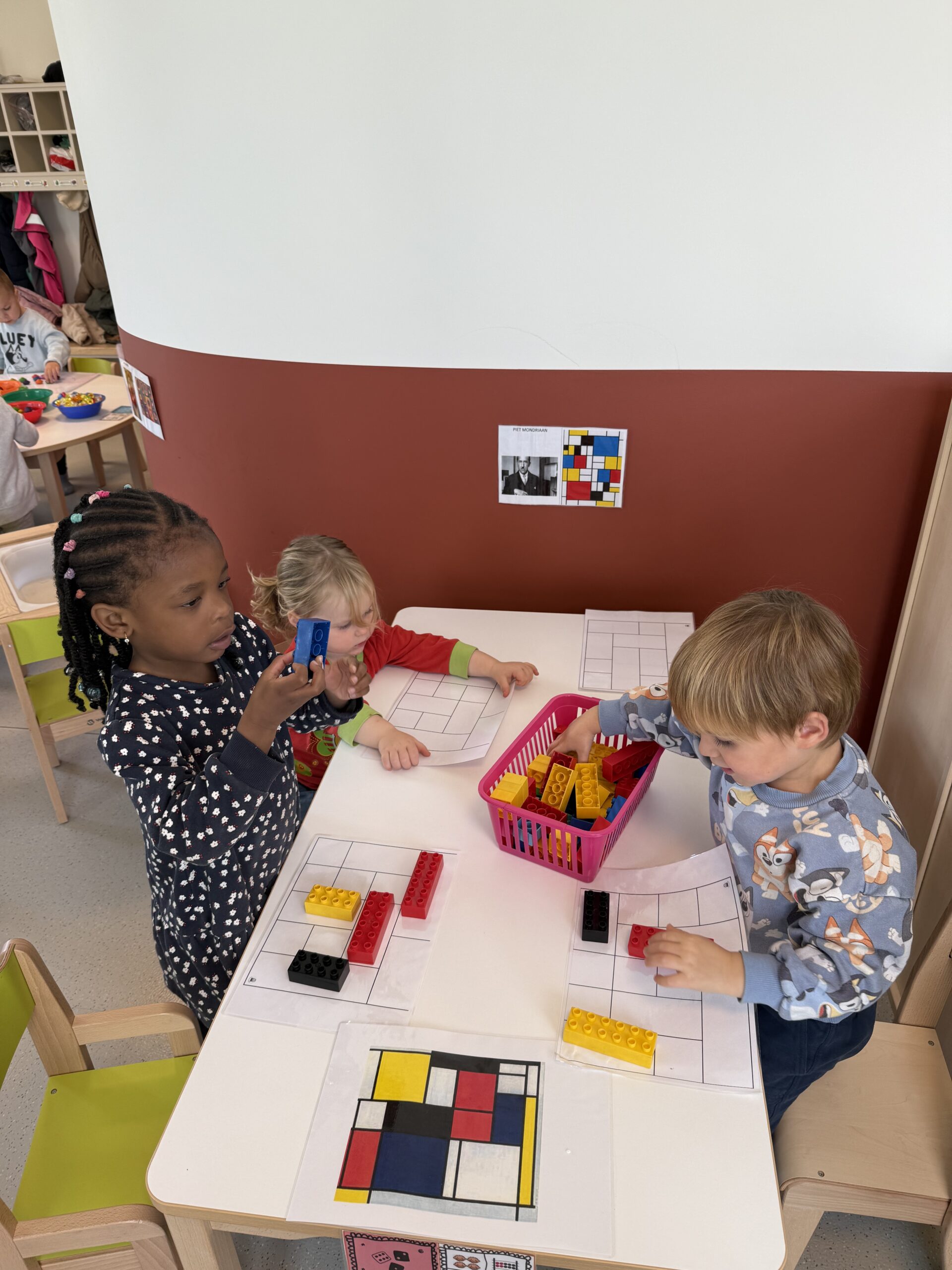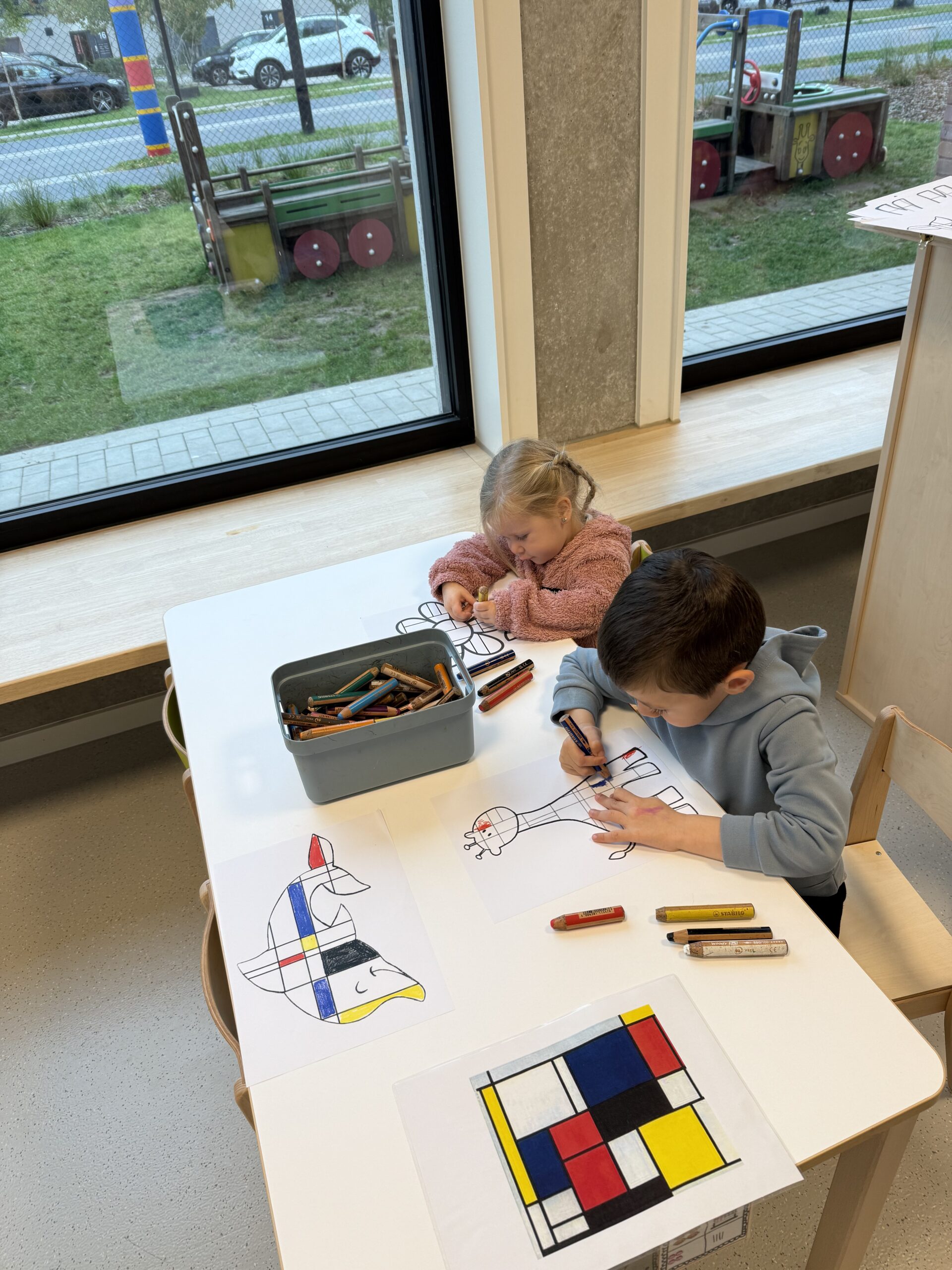 Aan de fijne motoriektafel konden ze zich laten inspireren door de kunstenaar Wassily Kandinsky. Met grote en kleine cirkels, lose parts en veel fantasie maakten ze hun eigen kunstwerk. Hier was geen goed of fout – alleen creativiteit en plezier!