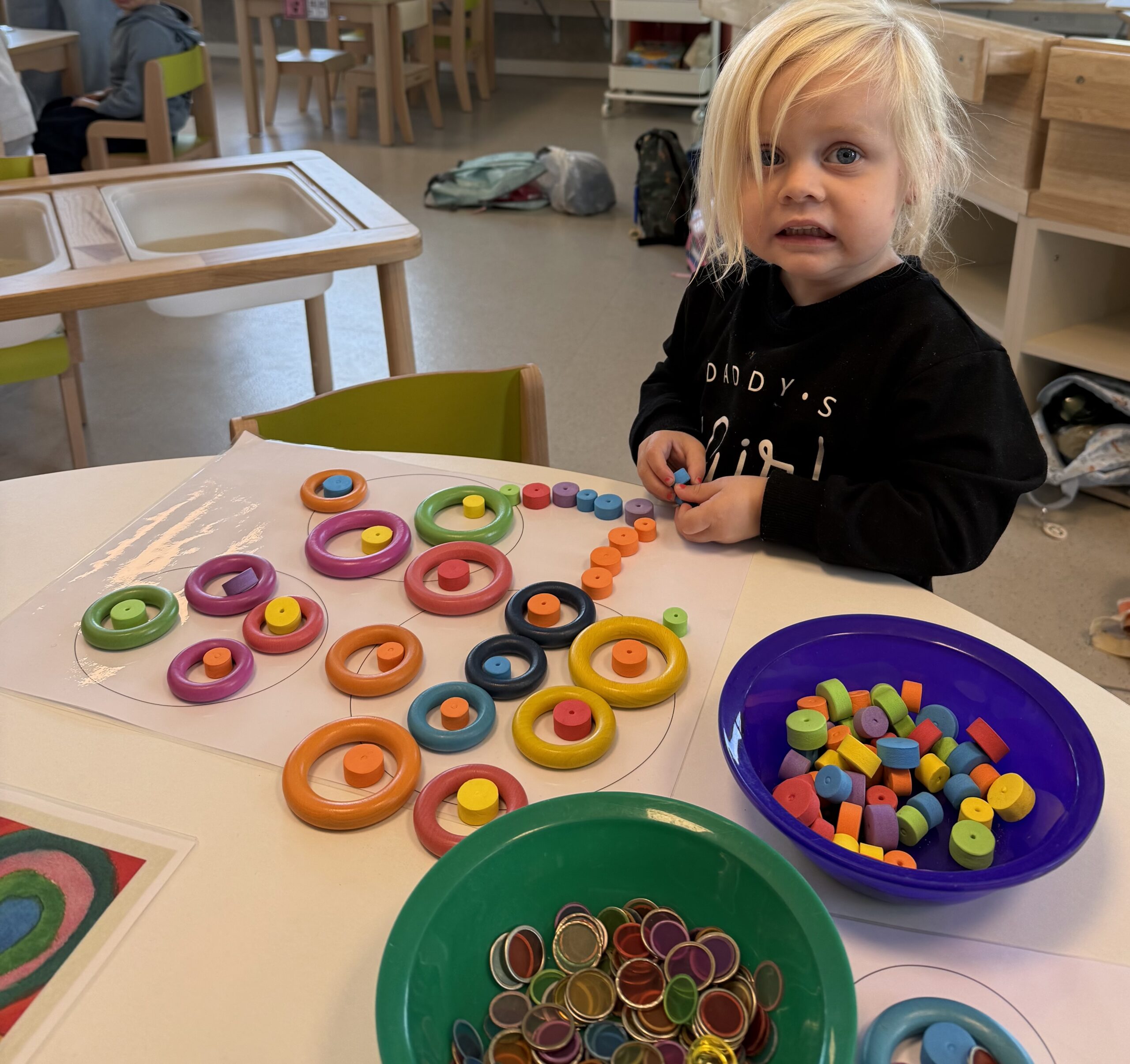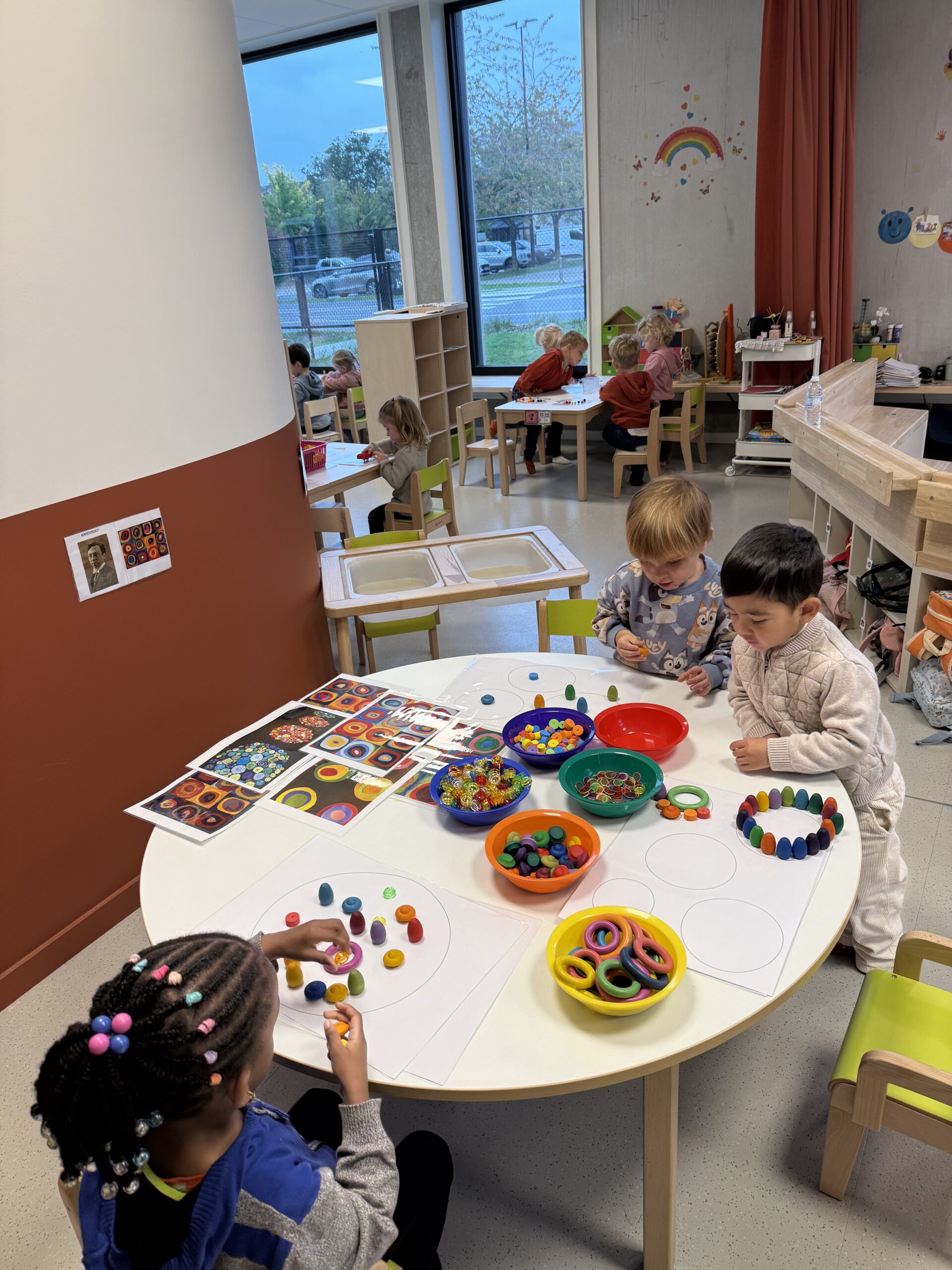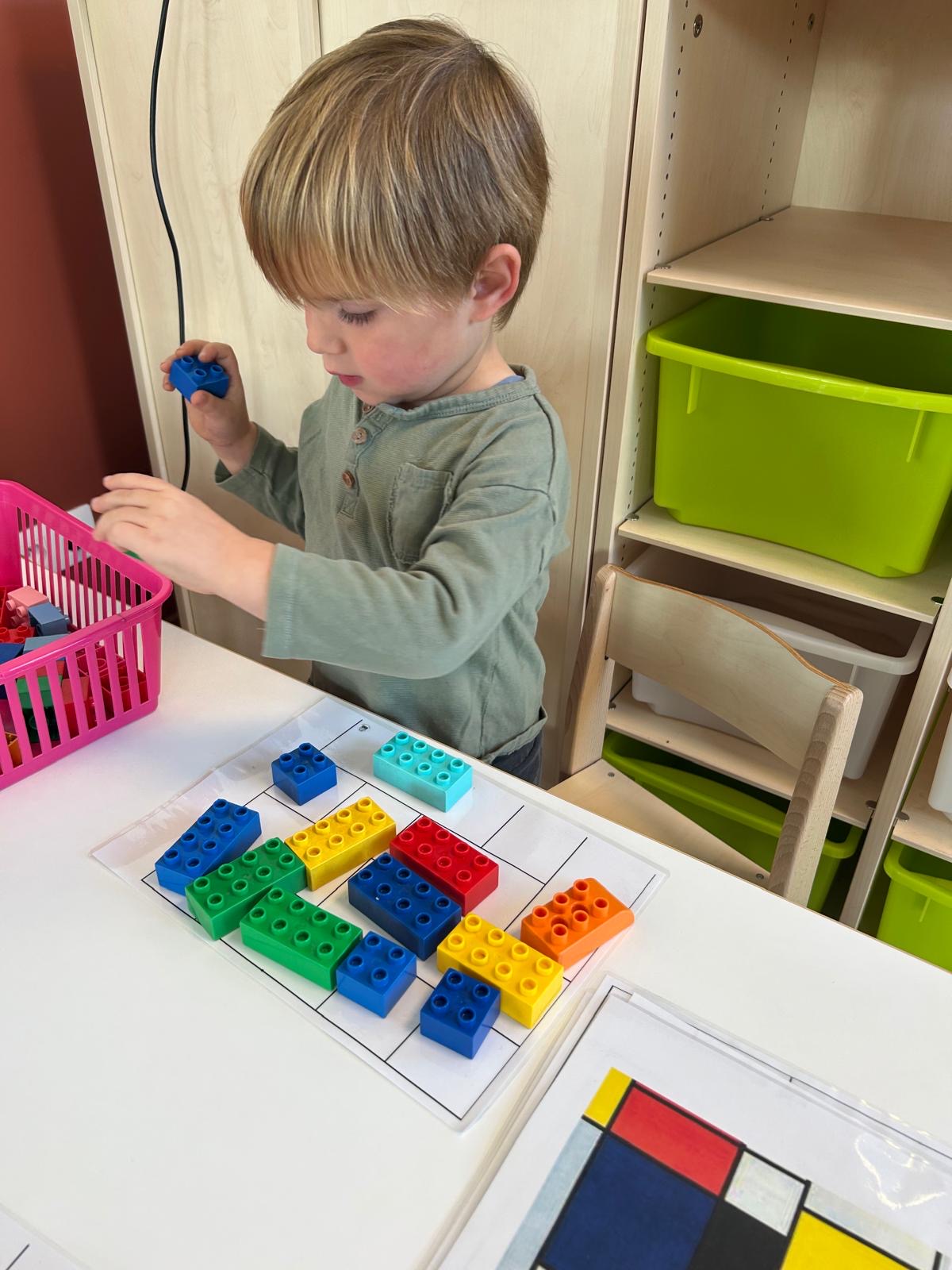 Aan de fijne motoriektafel konden ze zich laten inspireren door de kunstenaar Wassily Kandinsky. Met grote en kleine cirkels, lose parts en veel fantasie maakten ze hun eigen kunstwerk. Hier was geen goed of fout – alleen creativiteit en plezier!
