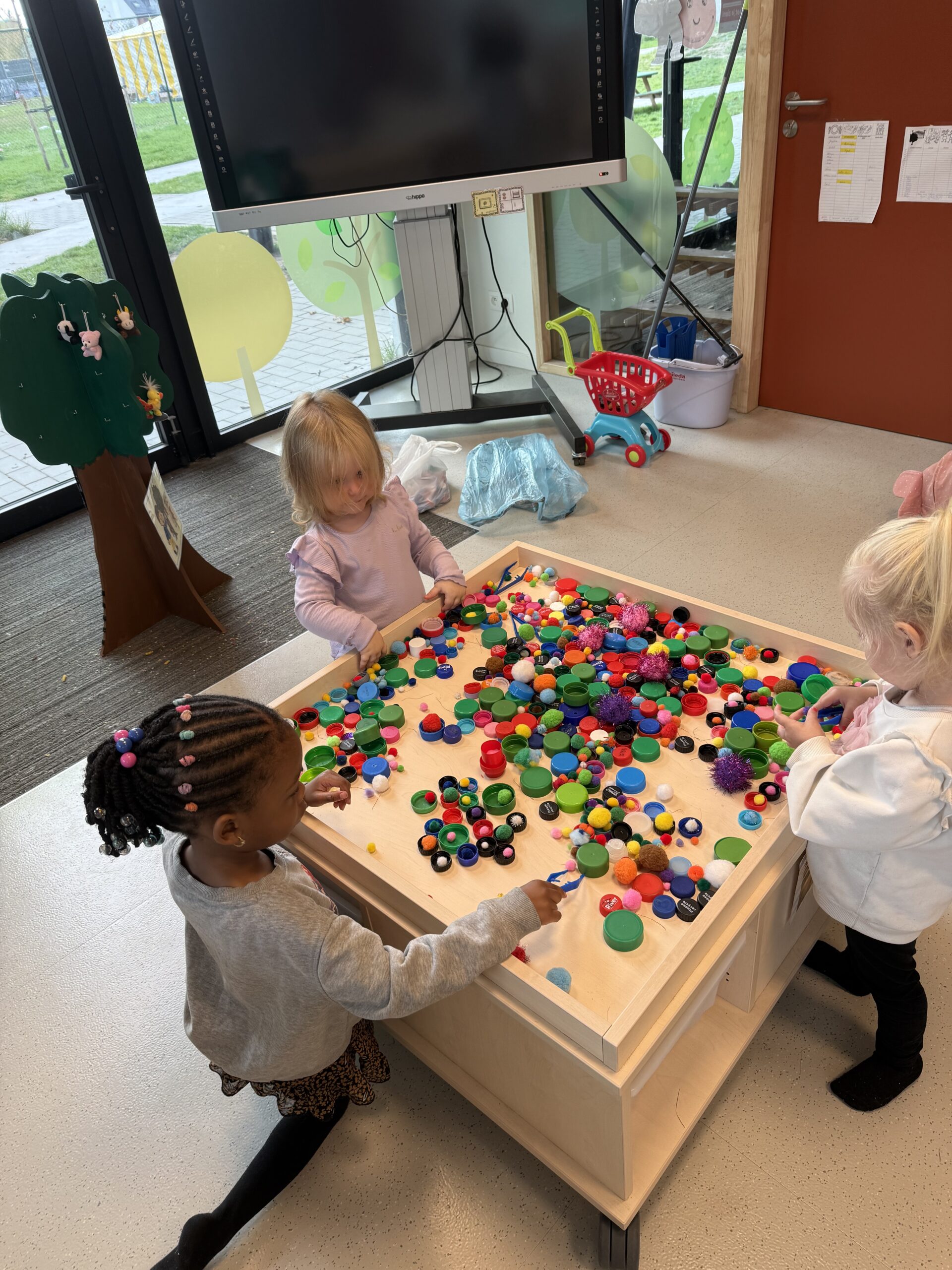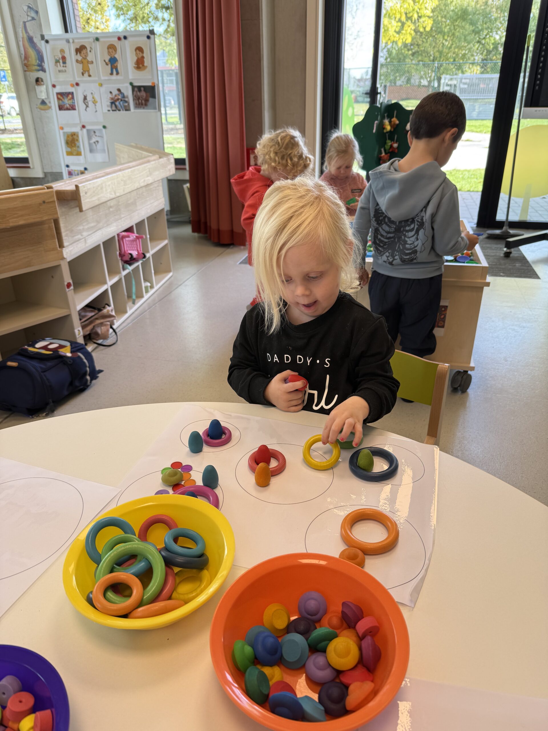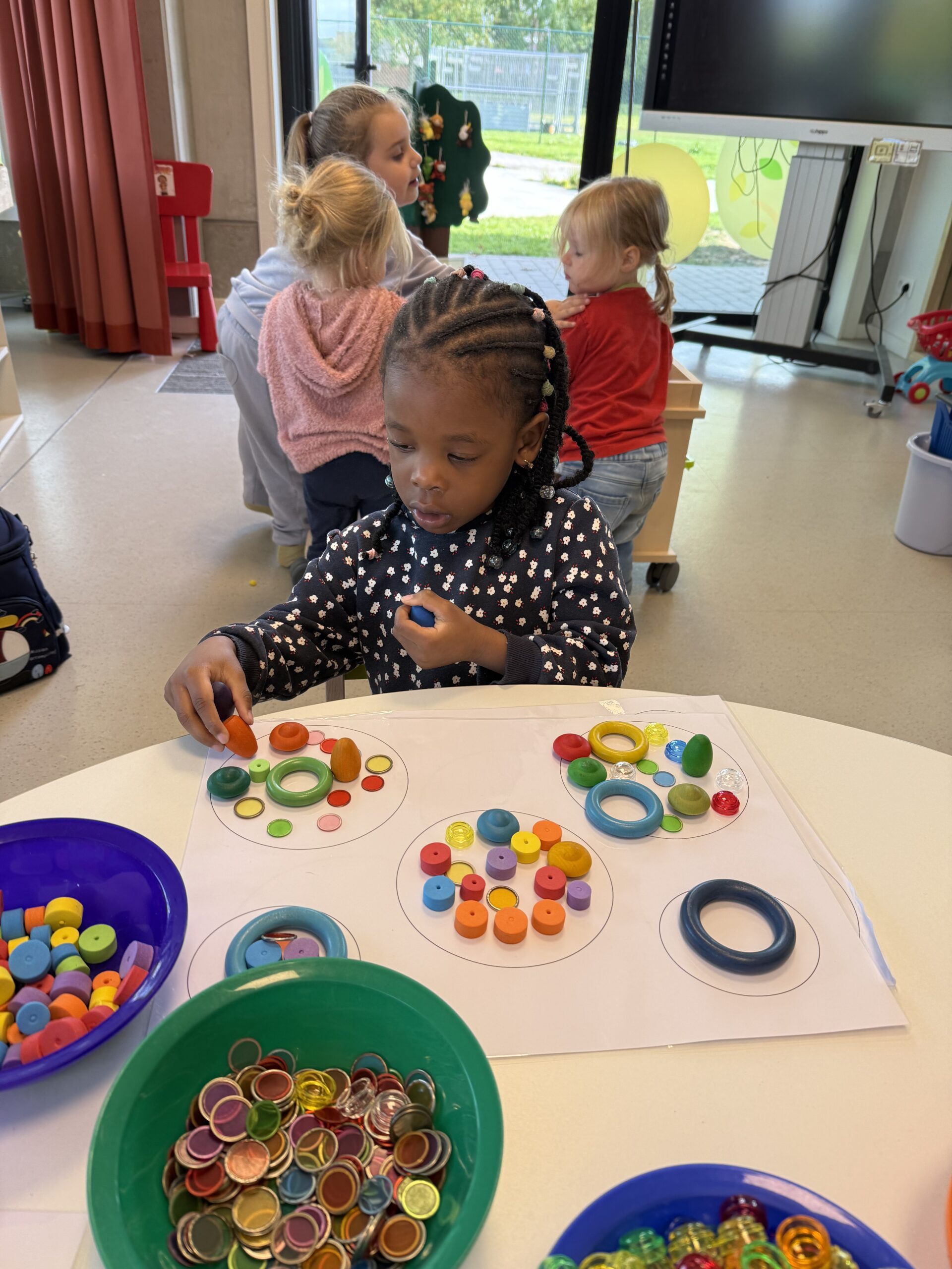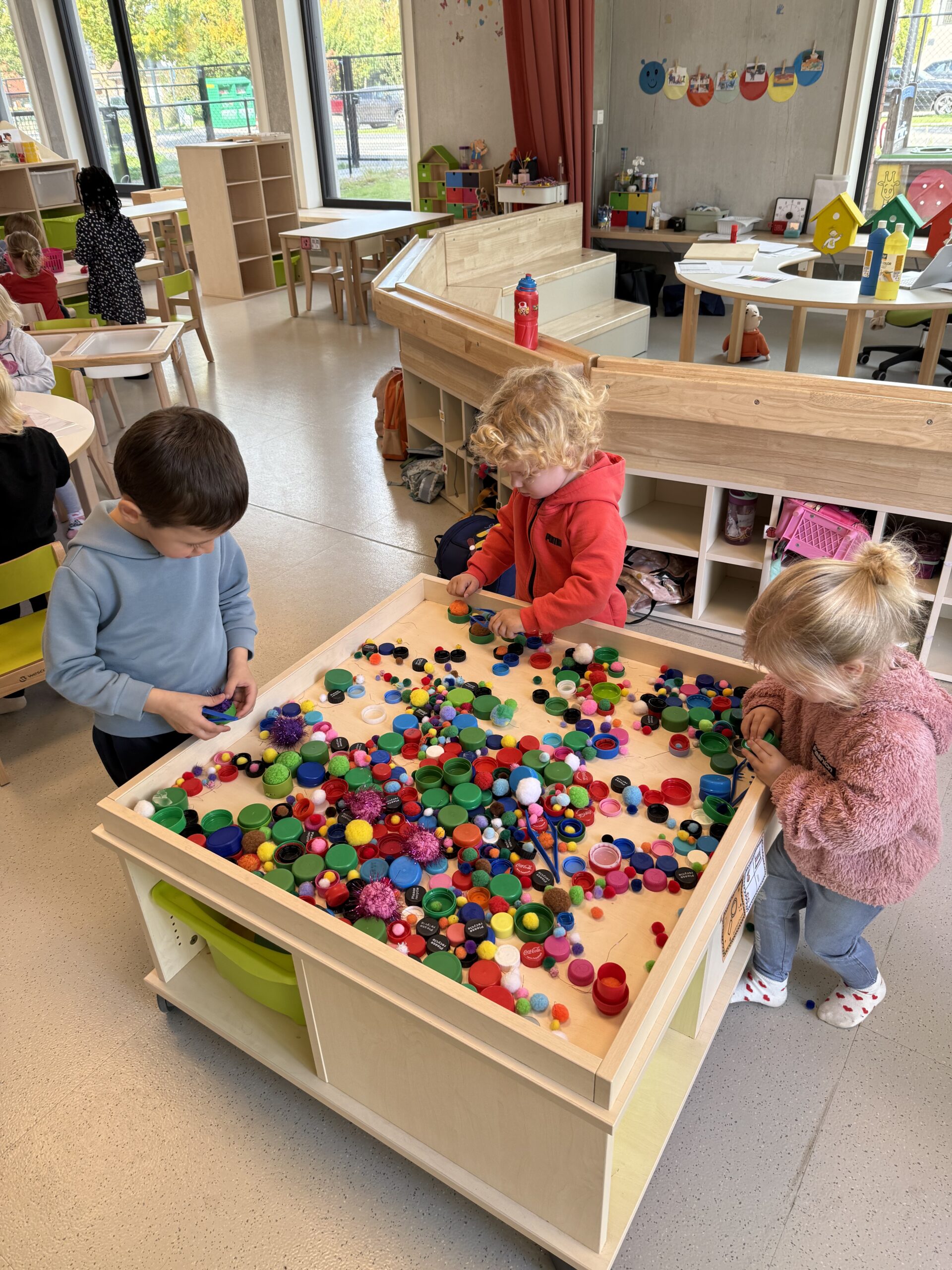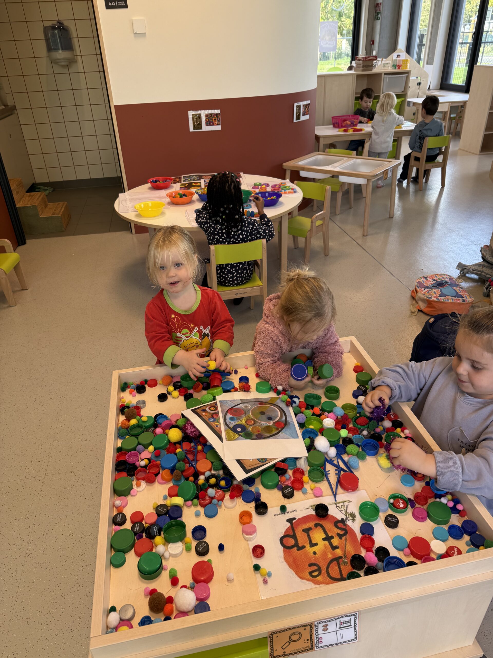 In de ontdekbak lagen allerlei dopjes in verschillende formaten. Hiermee konden de kinderen vrij experimenteren. Sommige kinderen maakten patronen, anderen bouwden torens of legden vormen. Zo speelden we met materialen én met ideeën.