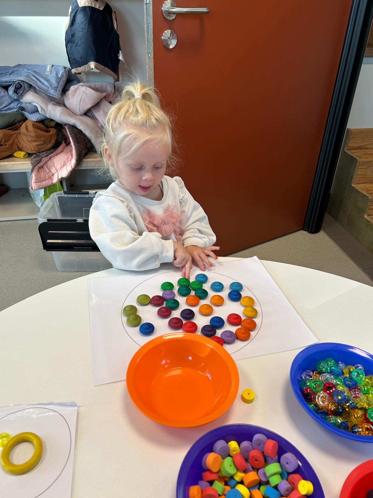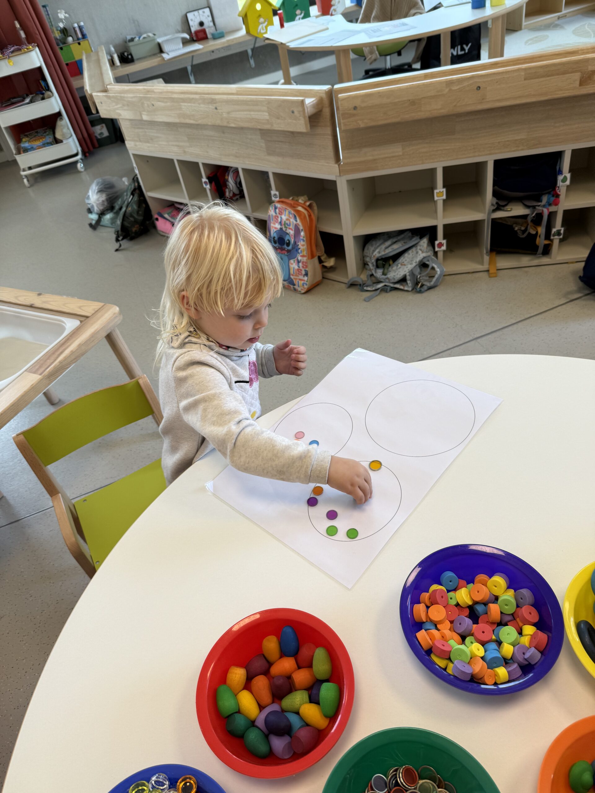 Op vlak van wiskunde legde ik deze week de nadruk op de 1/1-relatie en het tellen tot 3. De kinderen namen telkens drie spulletjes en legden daarna bij elk voorwerp een muntje. Op die manier leerden ze niet alleen tellen tot 3, maar ook dat er bij elk object precies één muntje hoort.