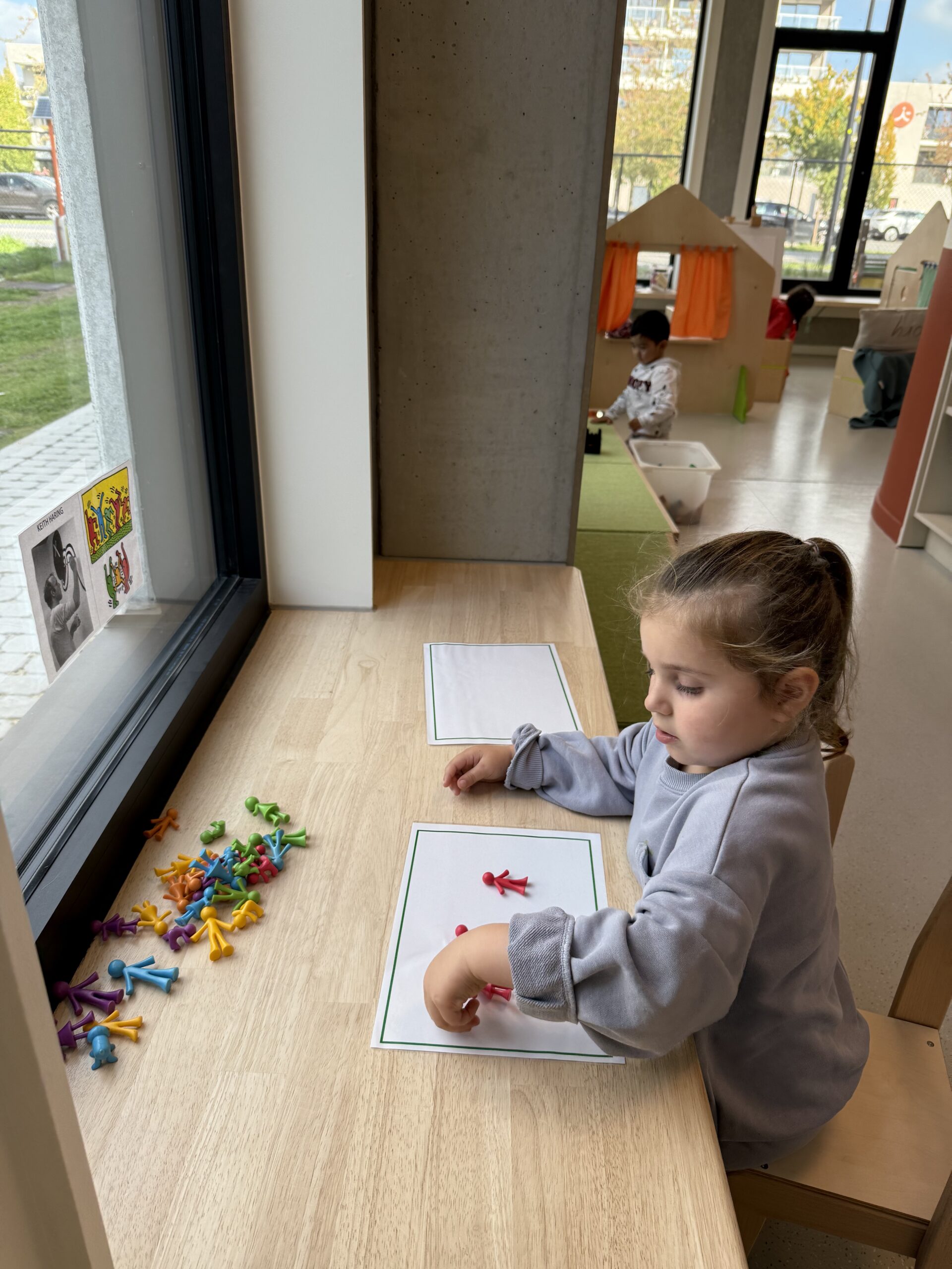 Deze week maakte ik samen met de kinderen kennis met de verschillende hoekjes in de klas en leerden we onze eerste afspraakjes: hoe we speelgoed delen, hoe we samen opruimen en hoe we elkaar helpen. De kinderen ontdekten ook hun eigen symbooltje, wat hen helpt om hun spulletjes en hun plaatsje terug te vinden.