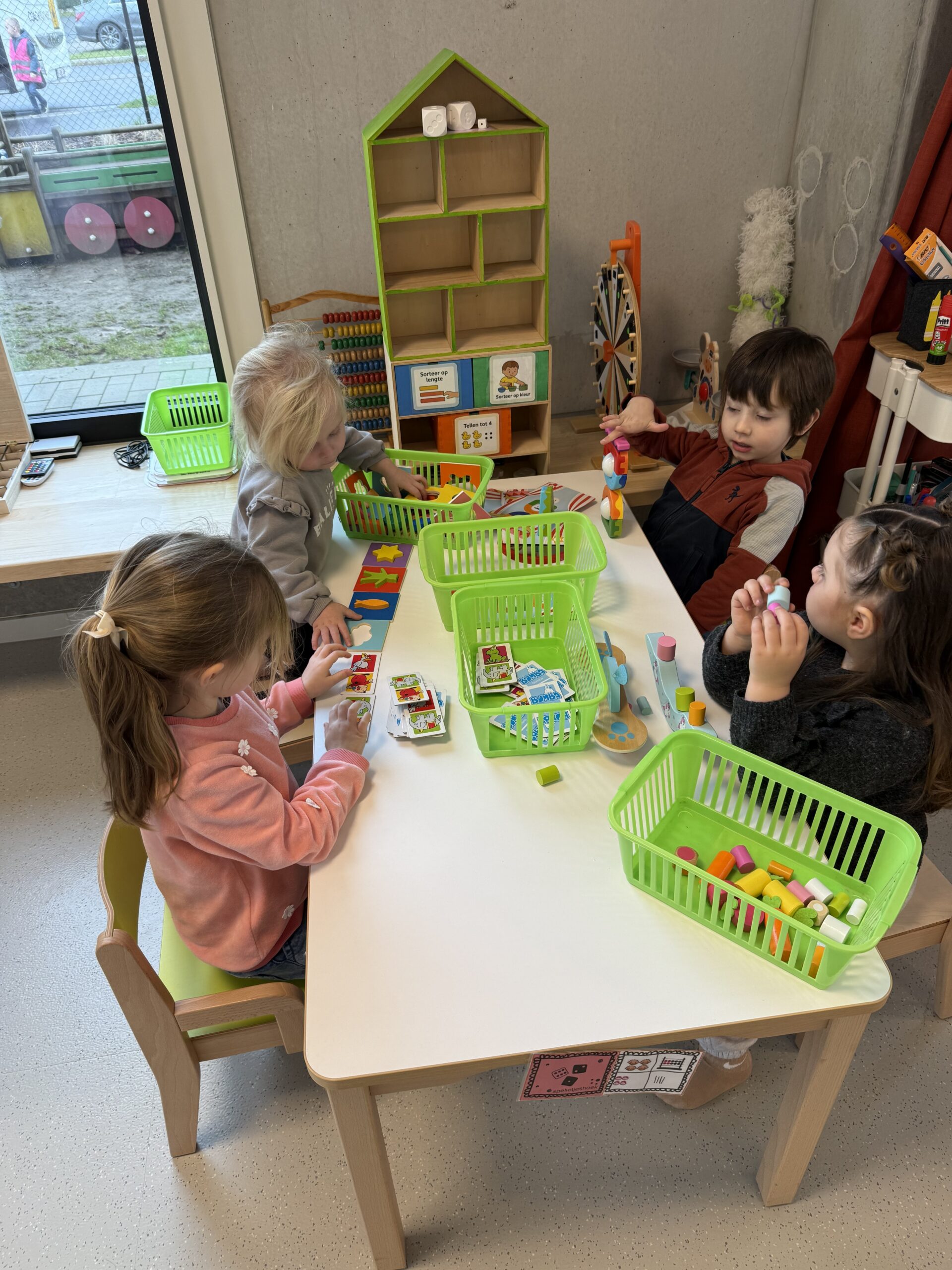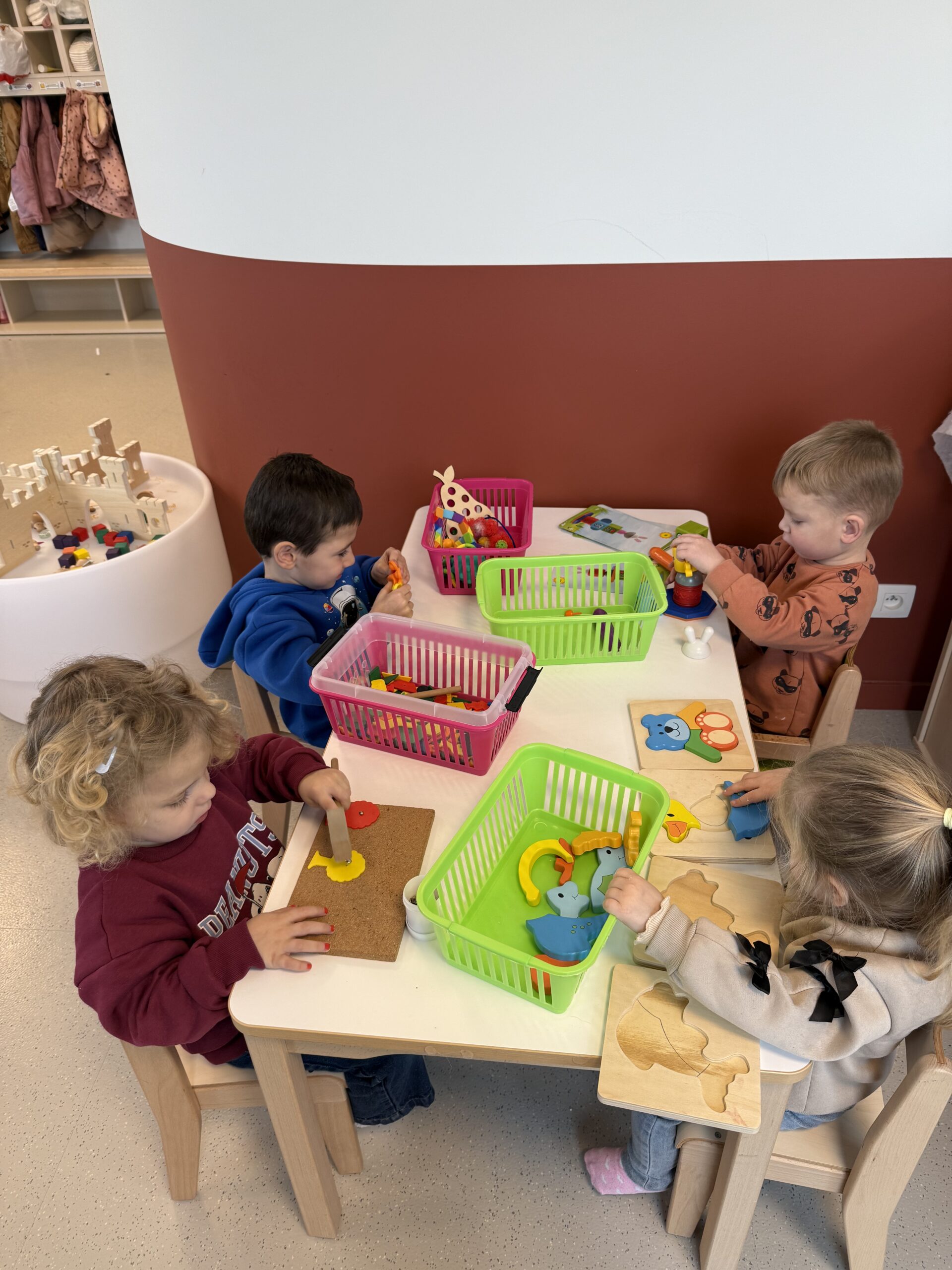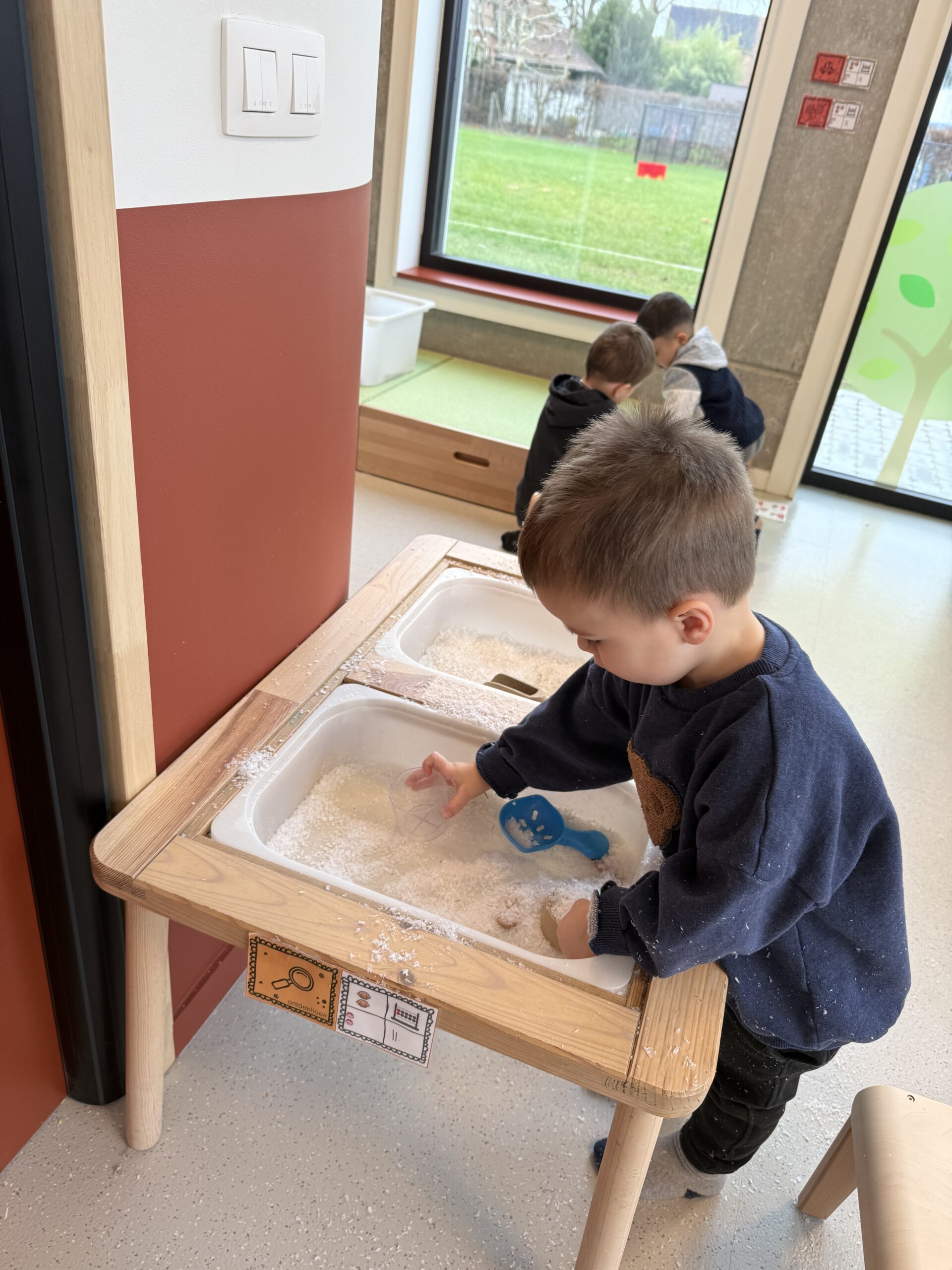 Aan de verteltafel ontdekten de kinderen een sneeuwlandschap waar zowel de peuters als de eerste kleuters hun fantasie volledig de vrije loop konden laten. Juf keek vol trots toe naar de mooie gesprekken die spontaan ontstonden.