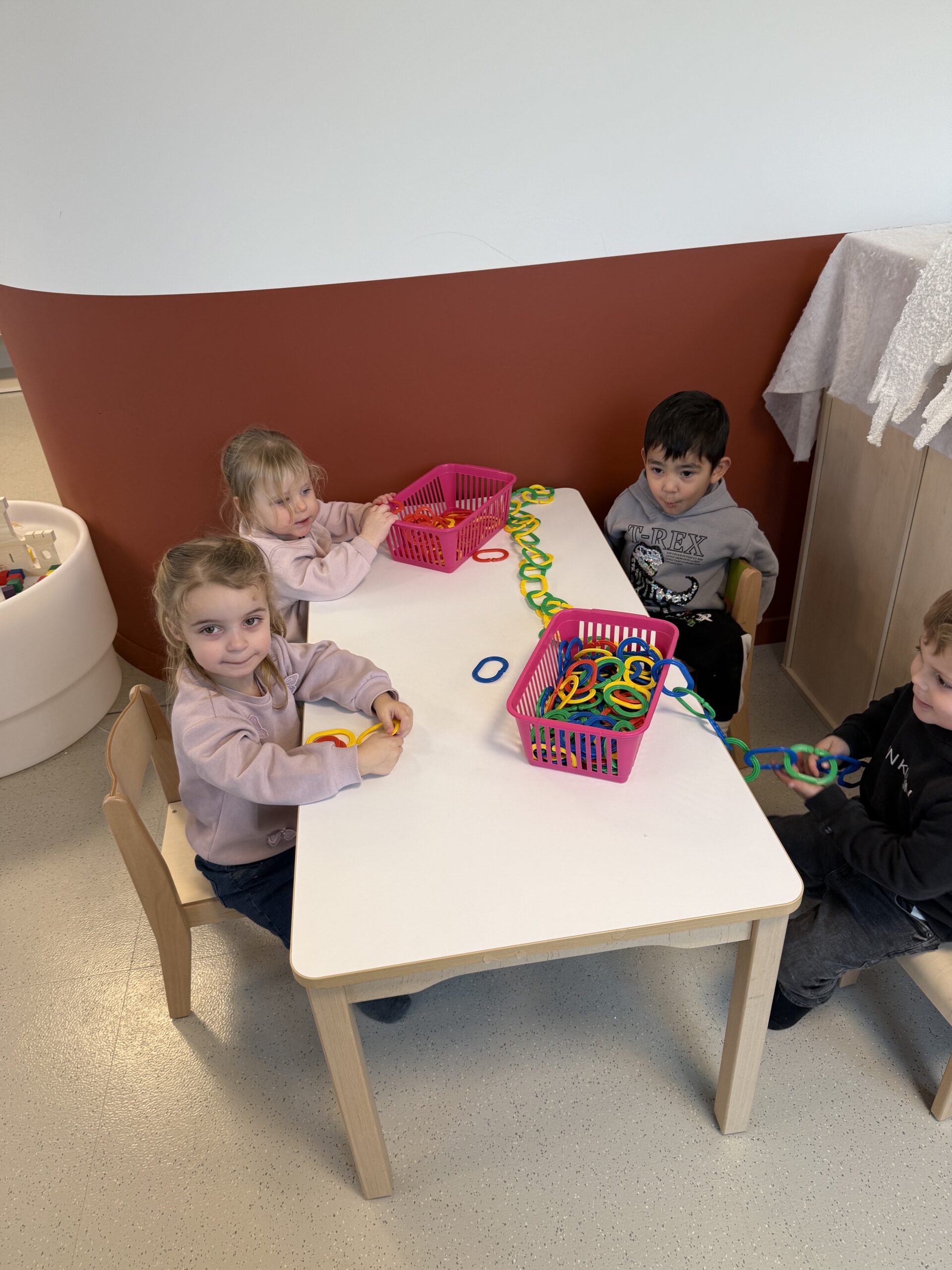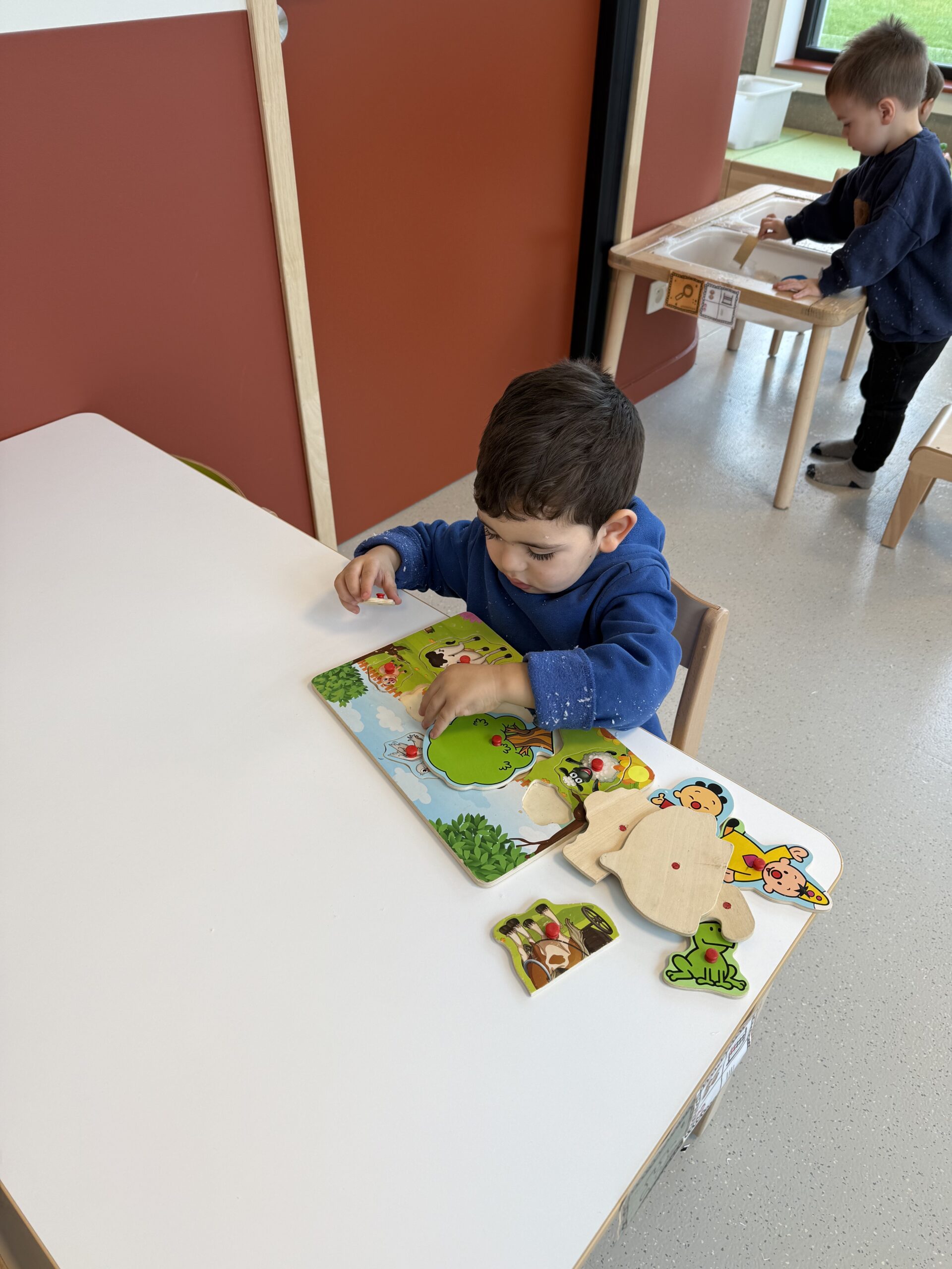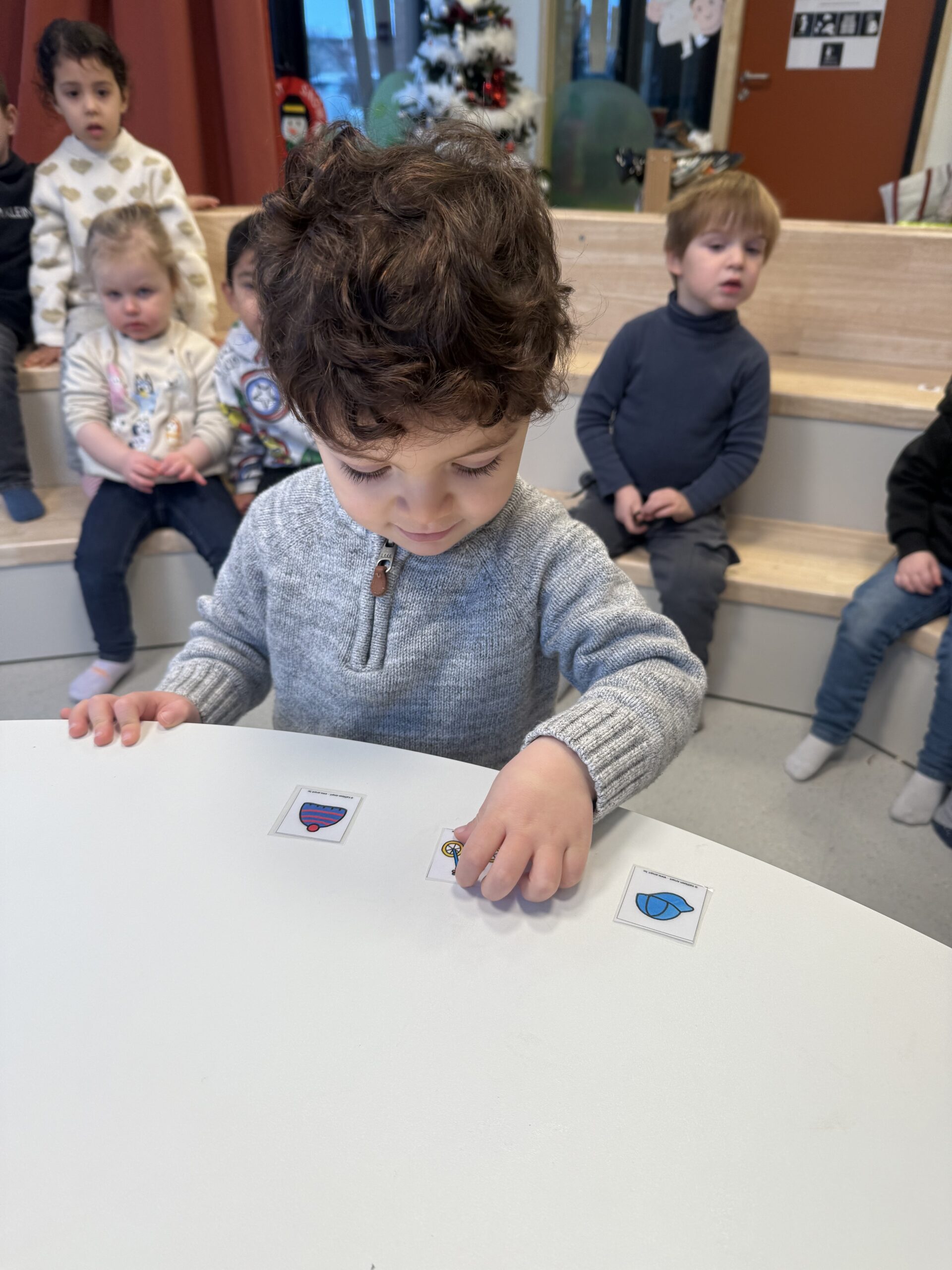 Aan de verteltafel ontdekten de kinderen een sneeuwlandschap waar zowel de peuters als de eerste kleuters hun fantasie volledig de vrije loop konden laten. Juf keek vol trots toe naar de mooie gesprekken die spontaan ontstonden.
