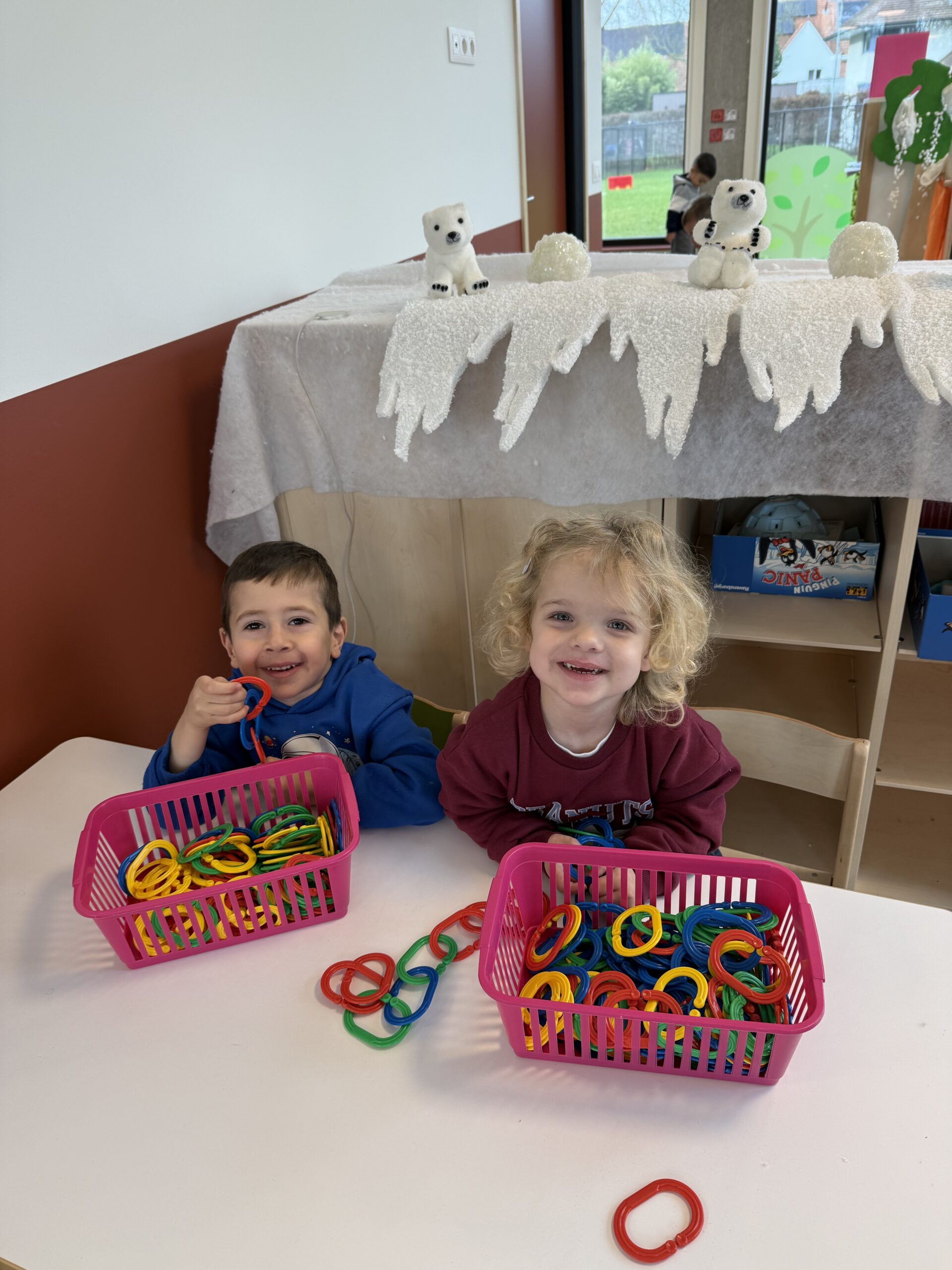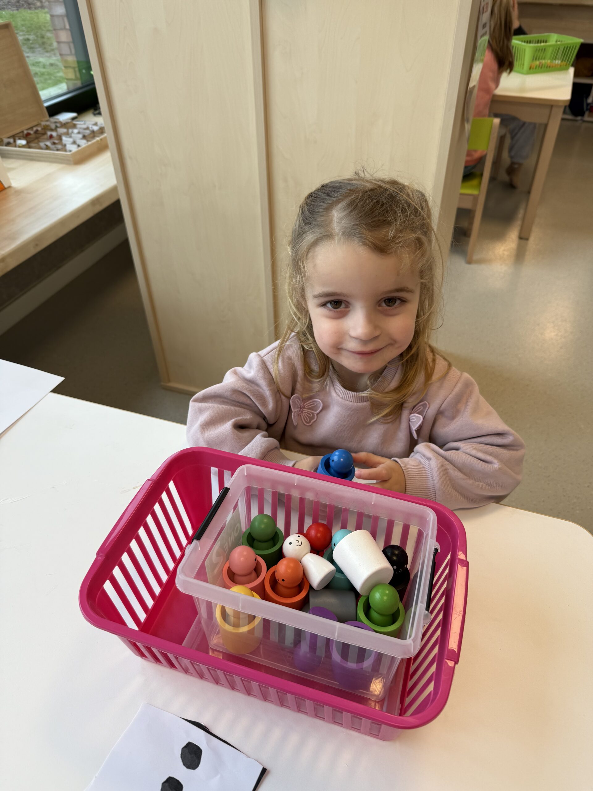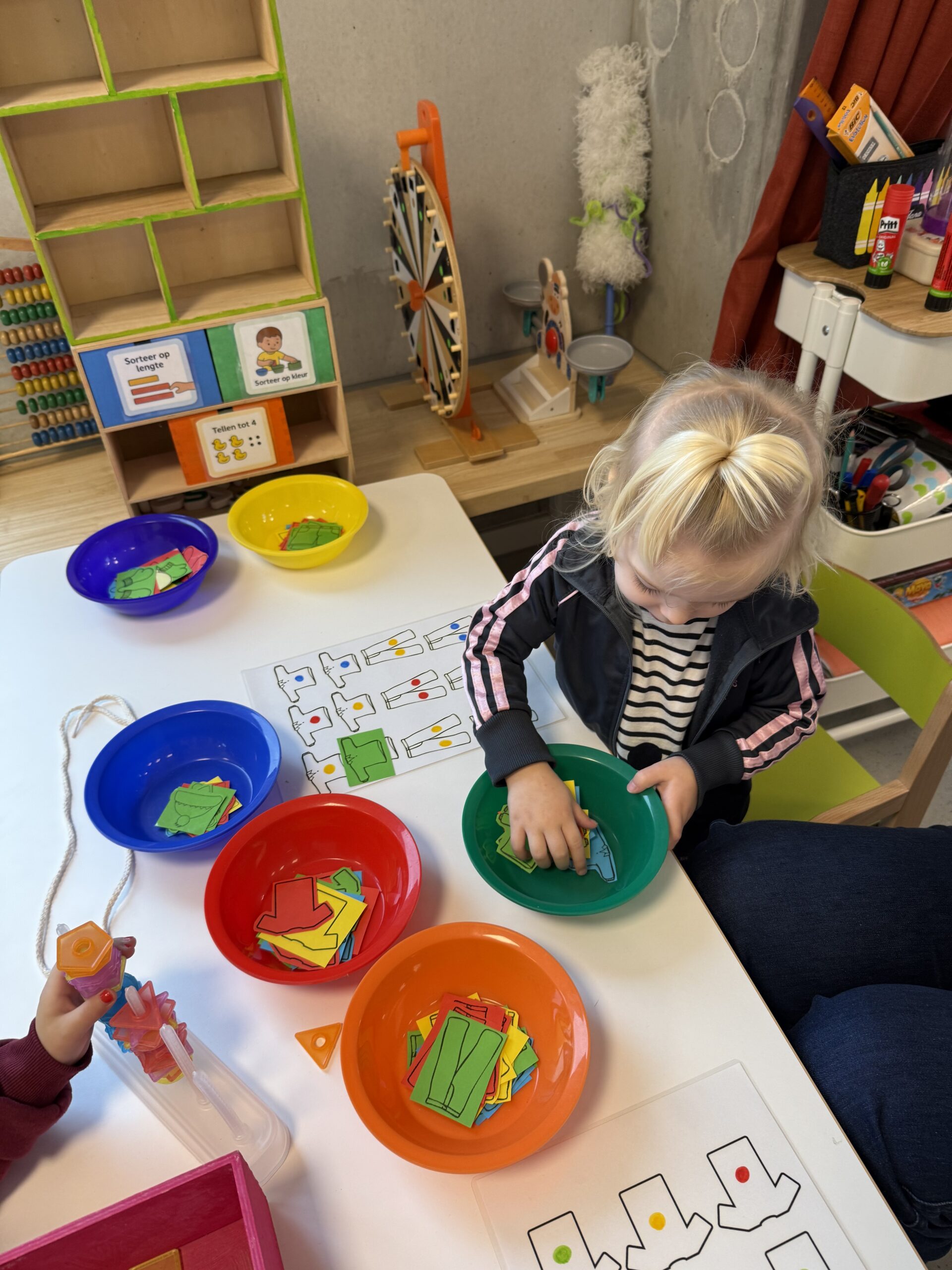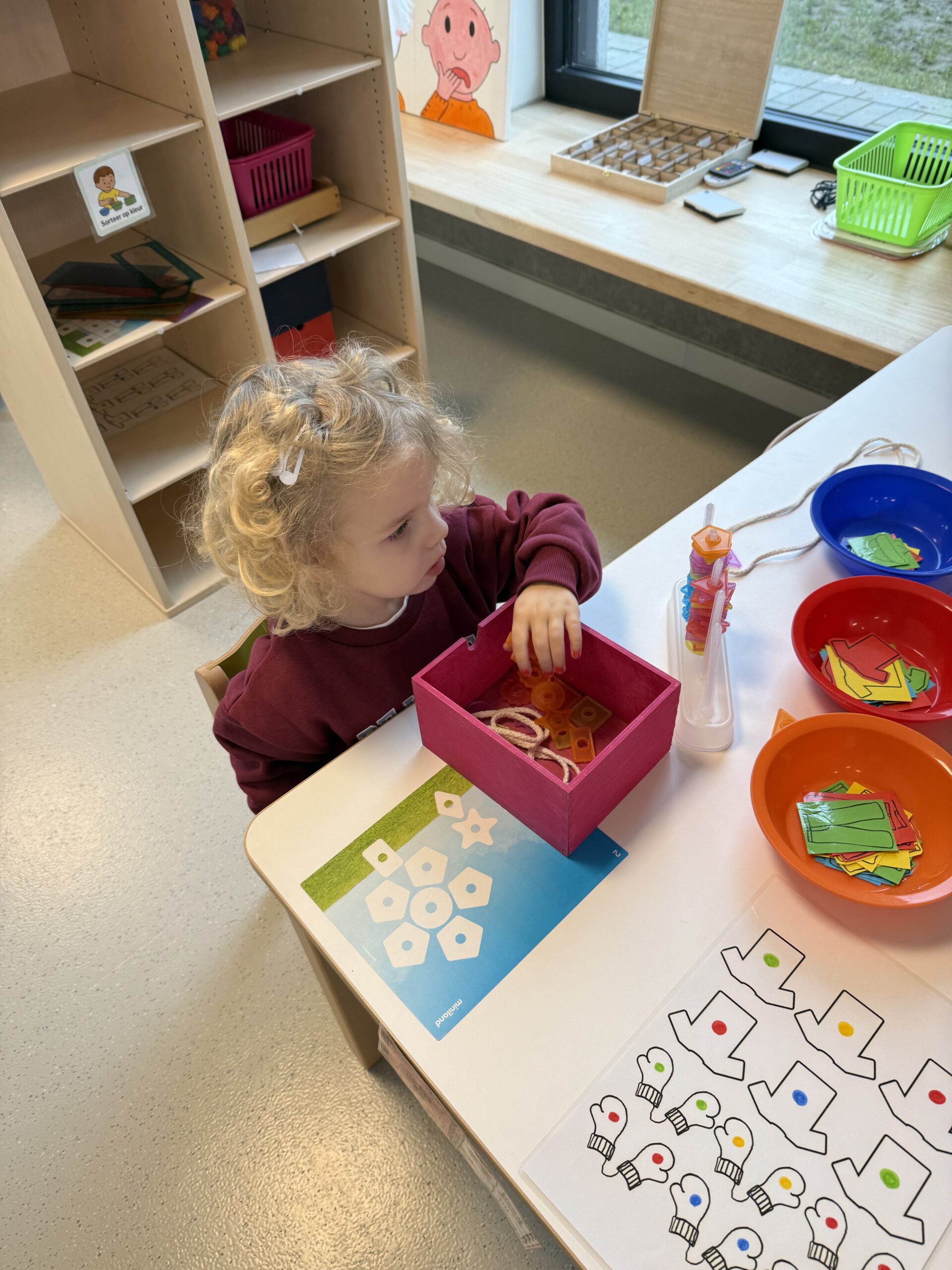 Daarna gingen we tijdens het hoekenwerk verder aan de slag met ons project ‘Winterwonderland – de wonderen van de winter’. Verschillende hoeken werden extra verrijkt: Aan de wiskundetafel konden de eerste kleuters verder oefenen op de vormen. Met behulp van een opdrachtkaart maakten ze een sneeuwpop met de juiste vormen. In de fijne handjeshoek oefenden de peuters op de kleurtjes en het hanteren van de pincetgreep. Ze bekeken hun sneeuwman en namen met de pincet de juiste gekleurde pompons.