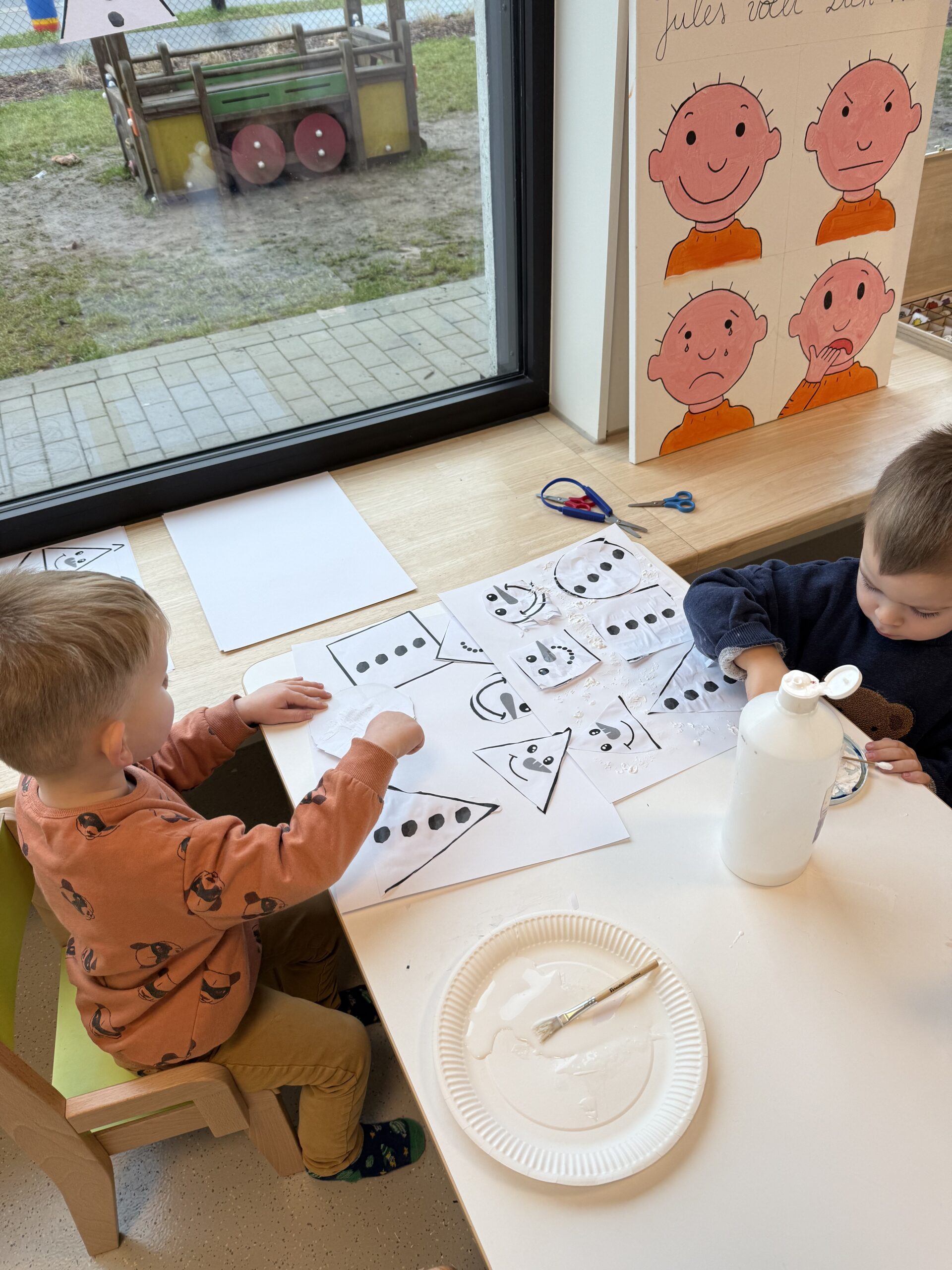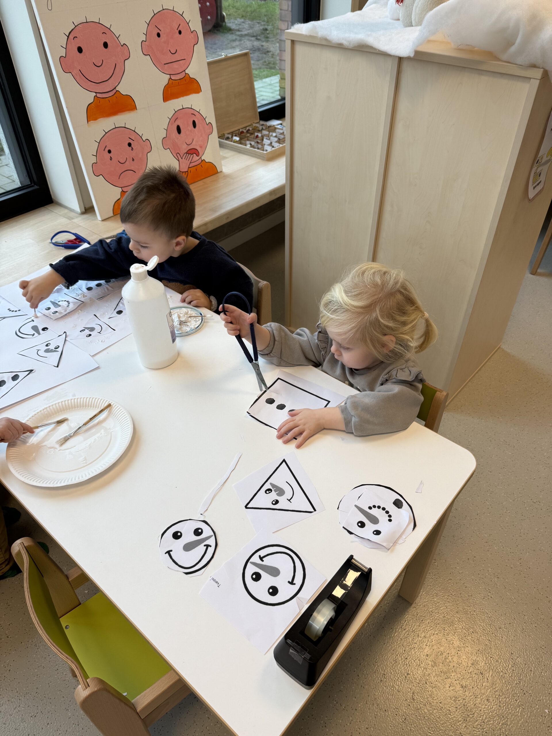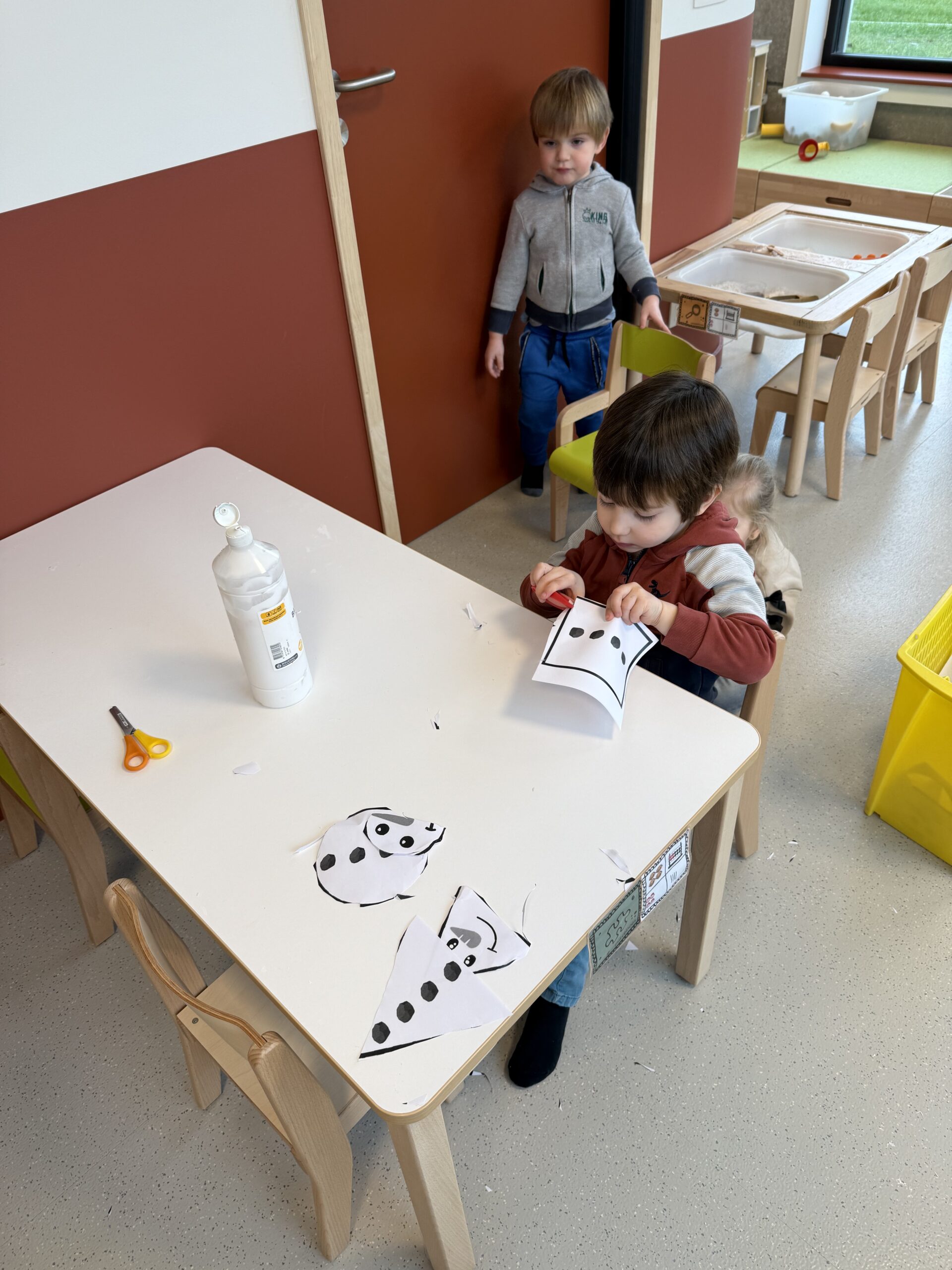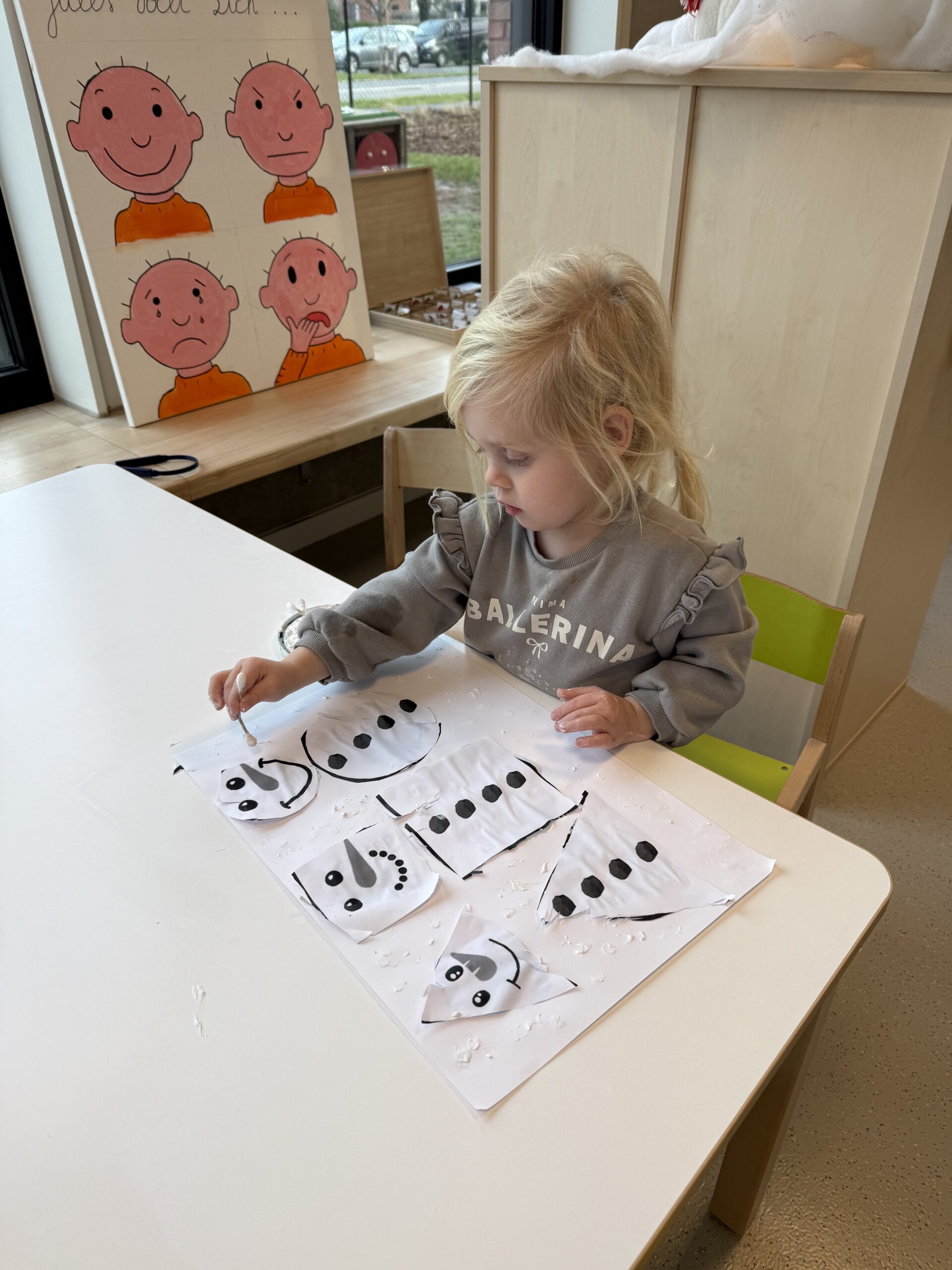 Aan de knutseltafel mochten de kinderen hun eigen sneeuwwolk maken. Bij de eerste kleuters werd ook de kniptechniek verder geoefend.