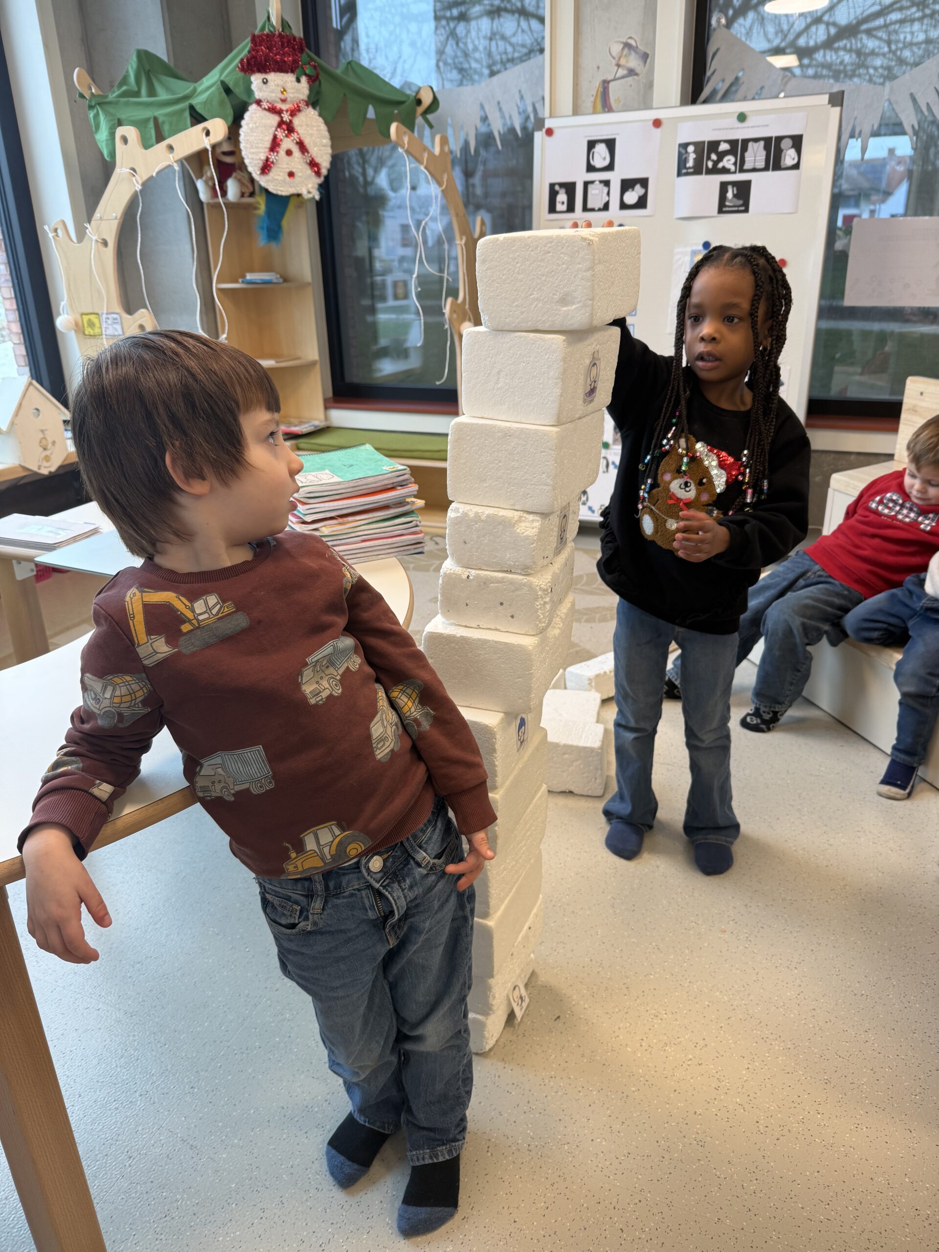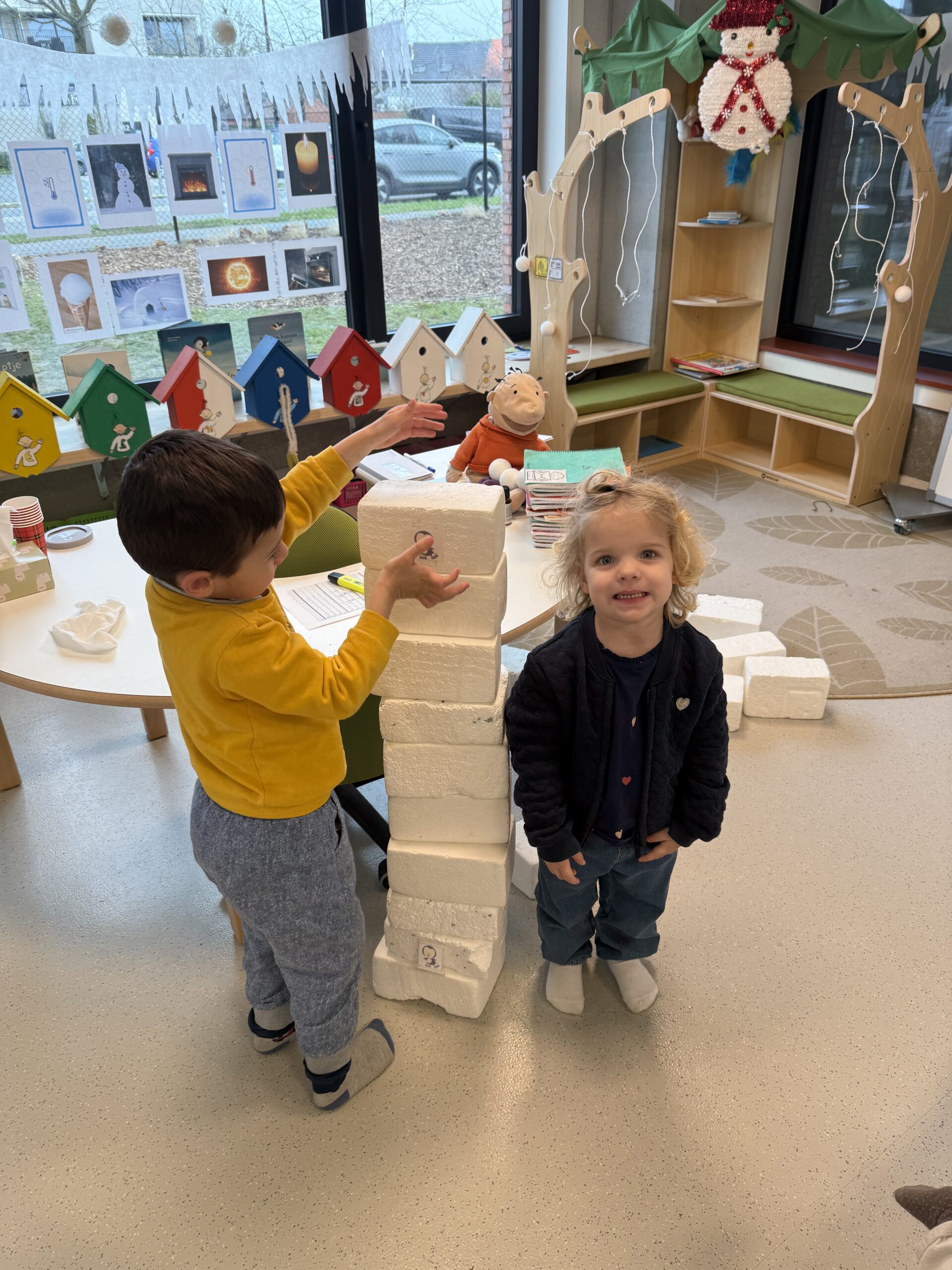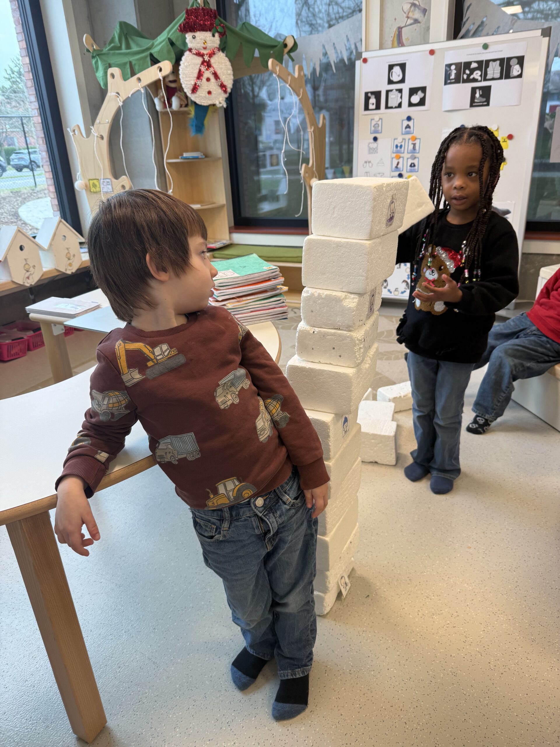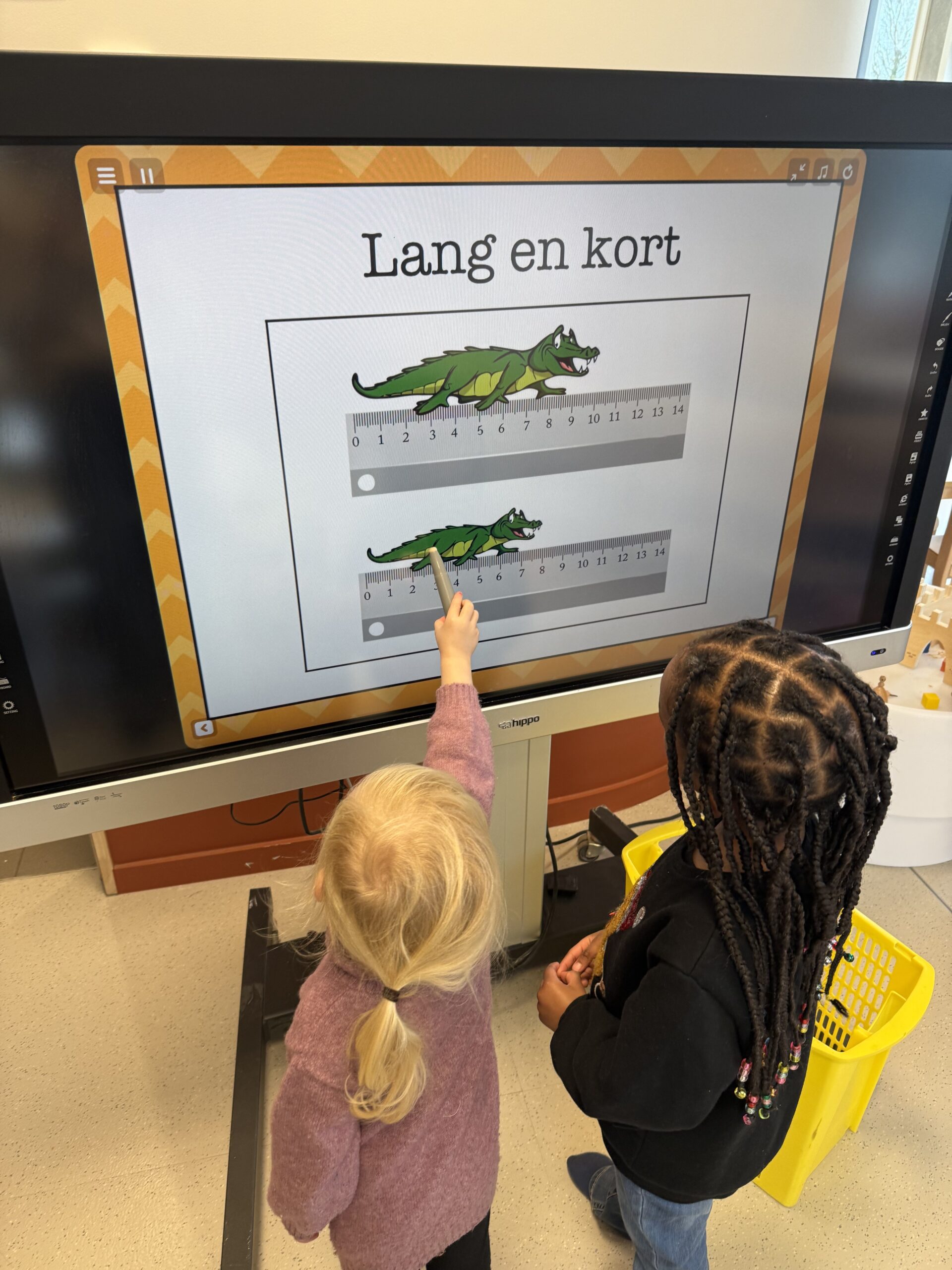 De begrippen korter, langer en even lang werden actief geoefend. De kinderen mochten een toren bouwen met sneeuwblokken die langer, korter of even lang waren als die van hun vriendje. Nadien werden deze begrippen verder ingeoefend op het grote scherm in de klas. Zo werden ook de digitale vaardigheden op een speelse manier geoefend.