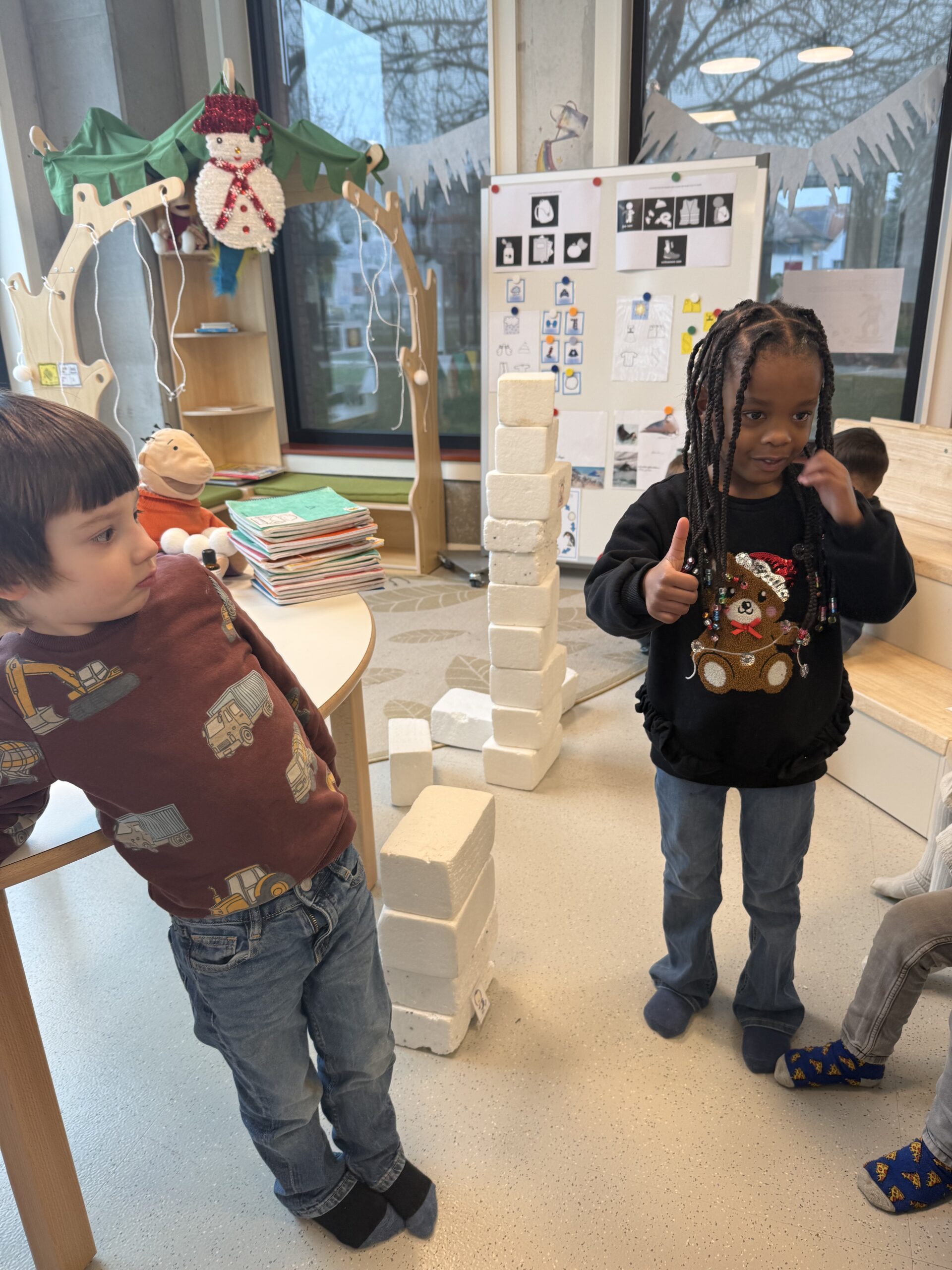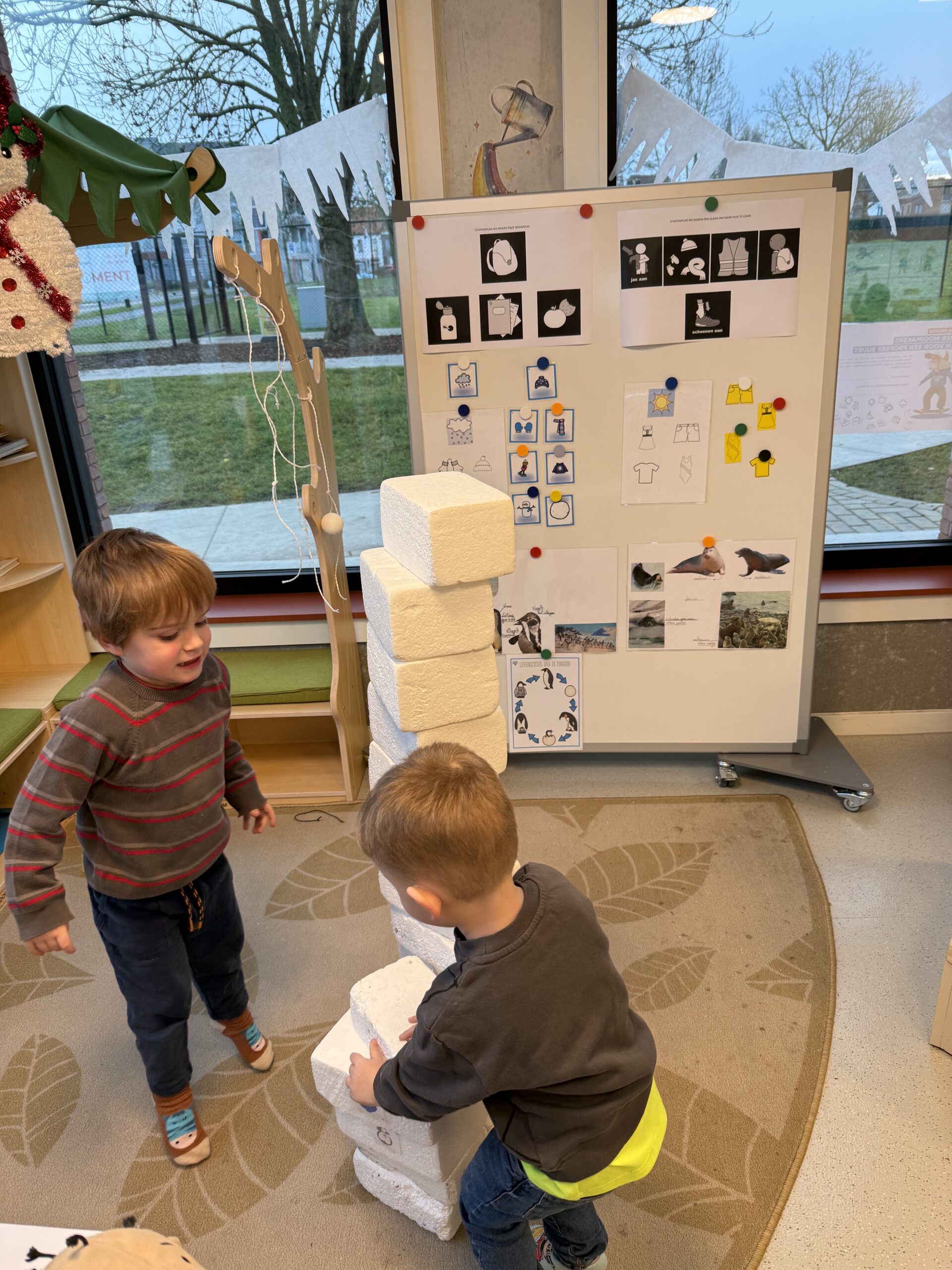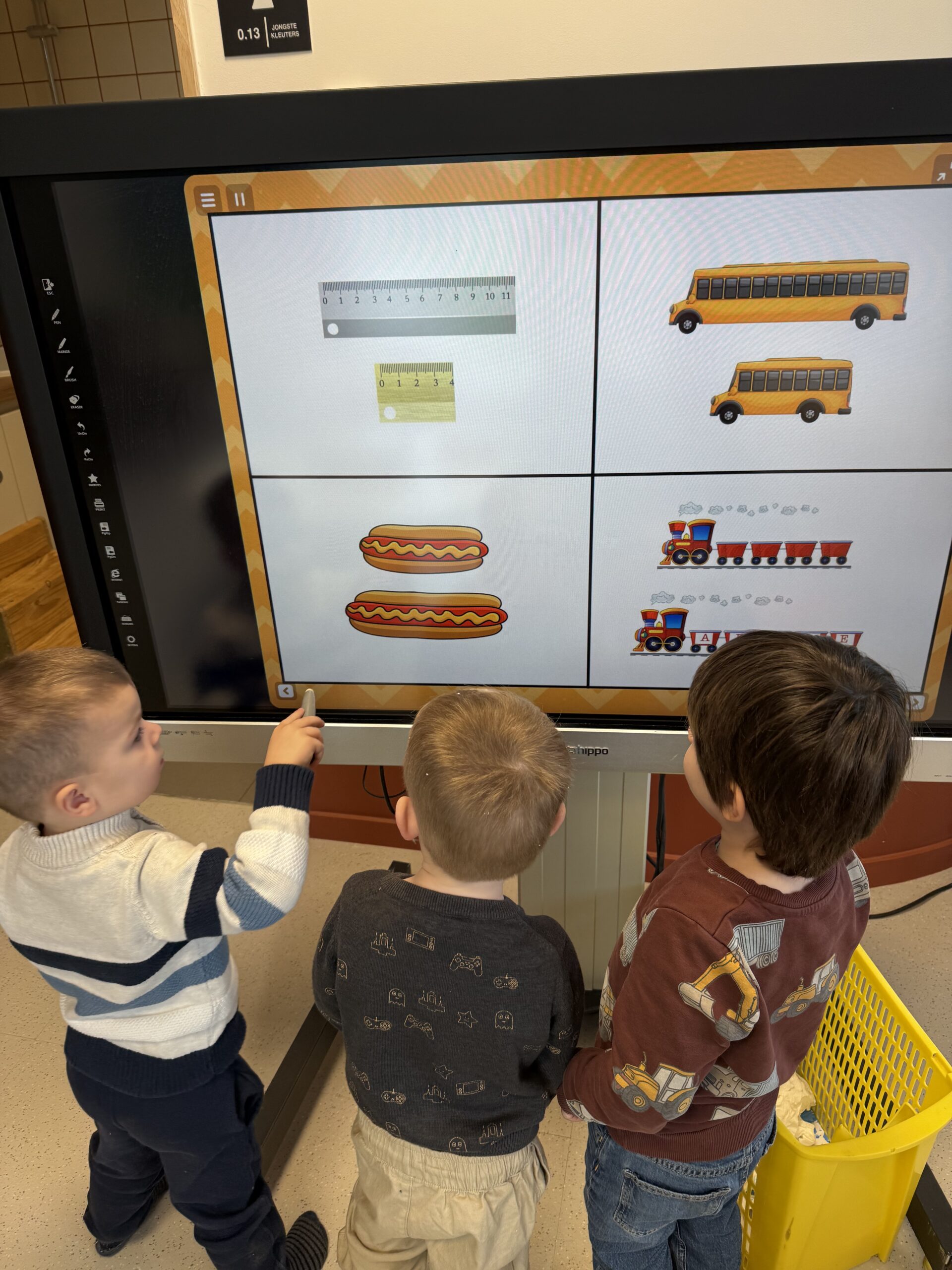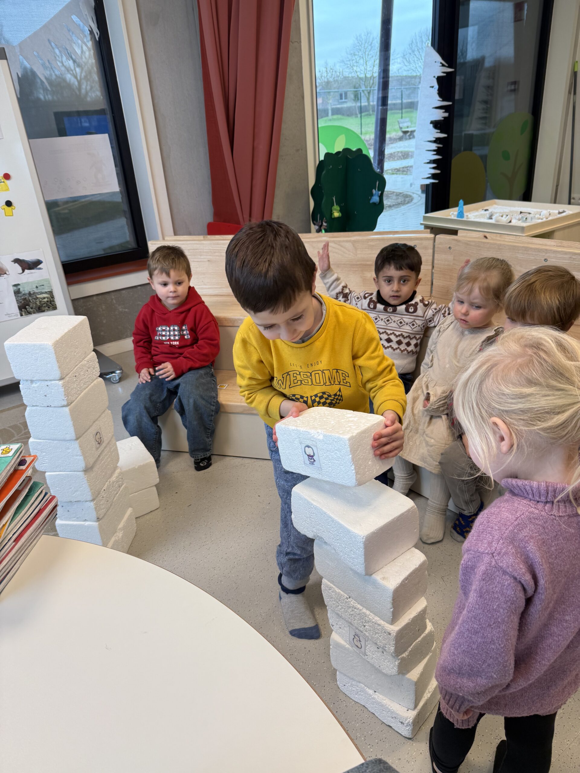 De begrippen korter, langer en even lang werden actief geoefend. De kinderen mochten een toren bouwen met sneeuwblokken die langer, korter of even lang waren als die van hun vriendje. Nadien werden deze begrippen verder ingeoefend op het grote scherm in de klas. Zo werden ook de digitale vaardigheden op een speelse manier geoefend.