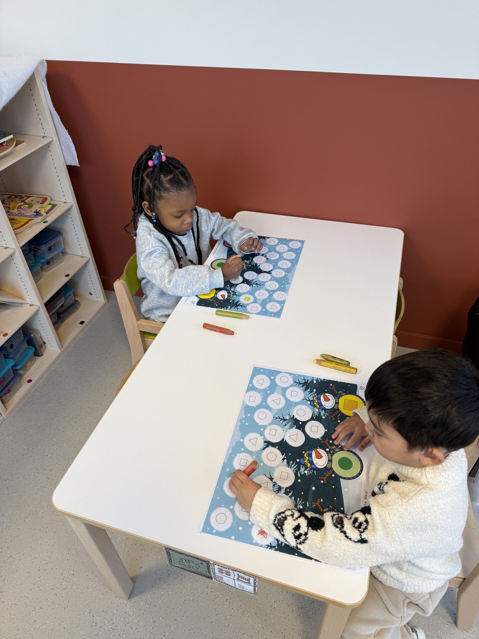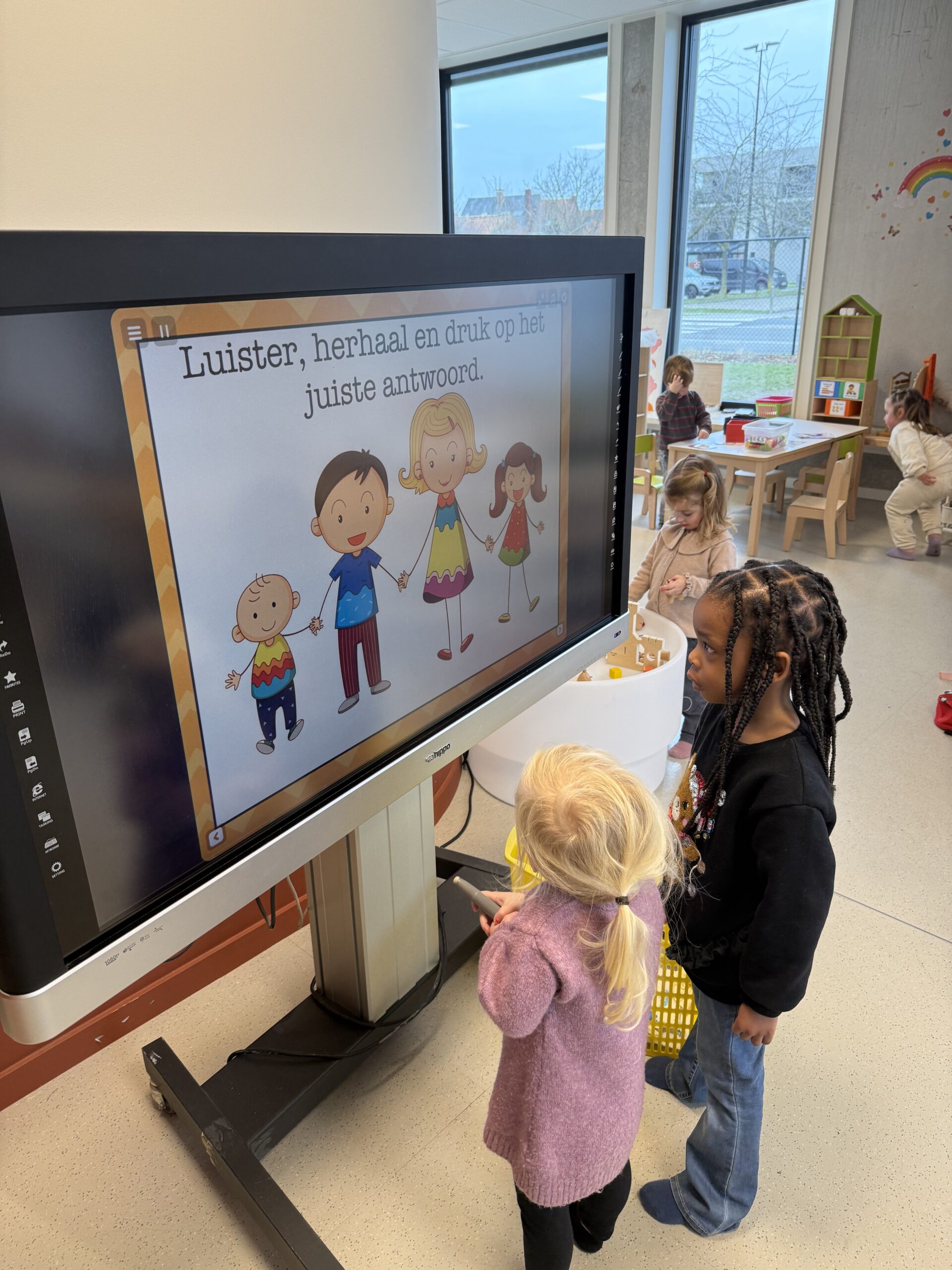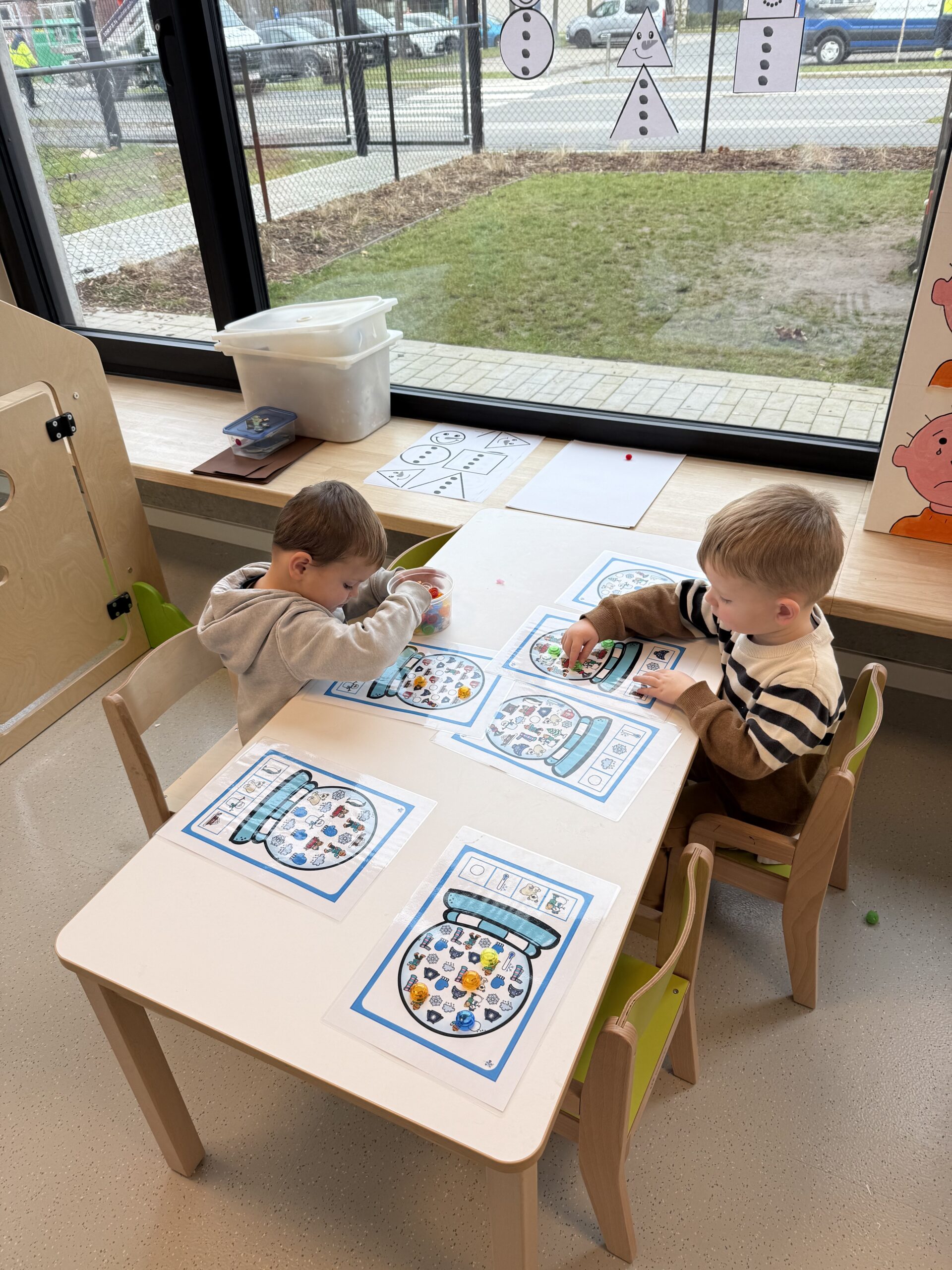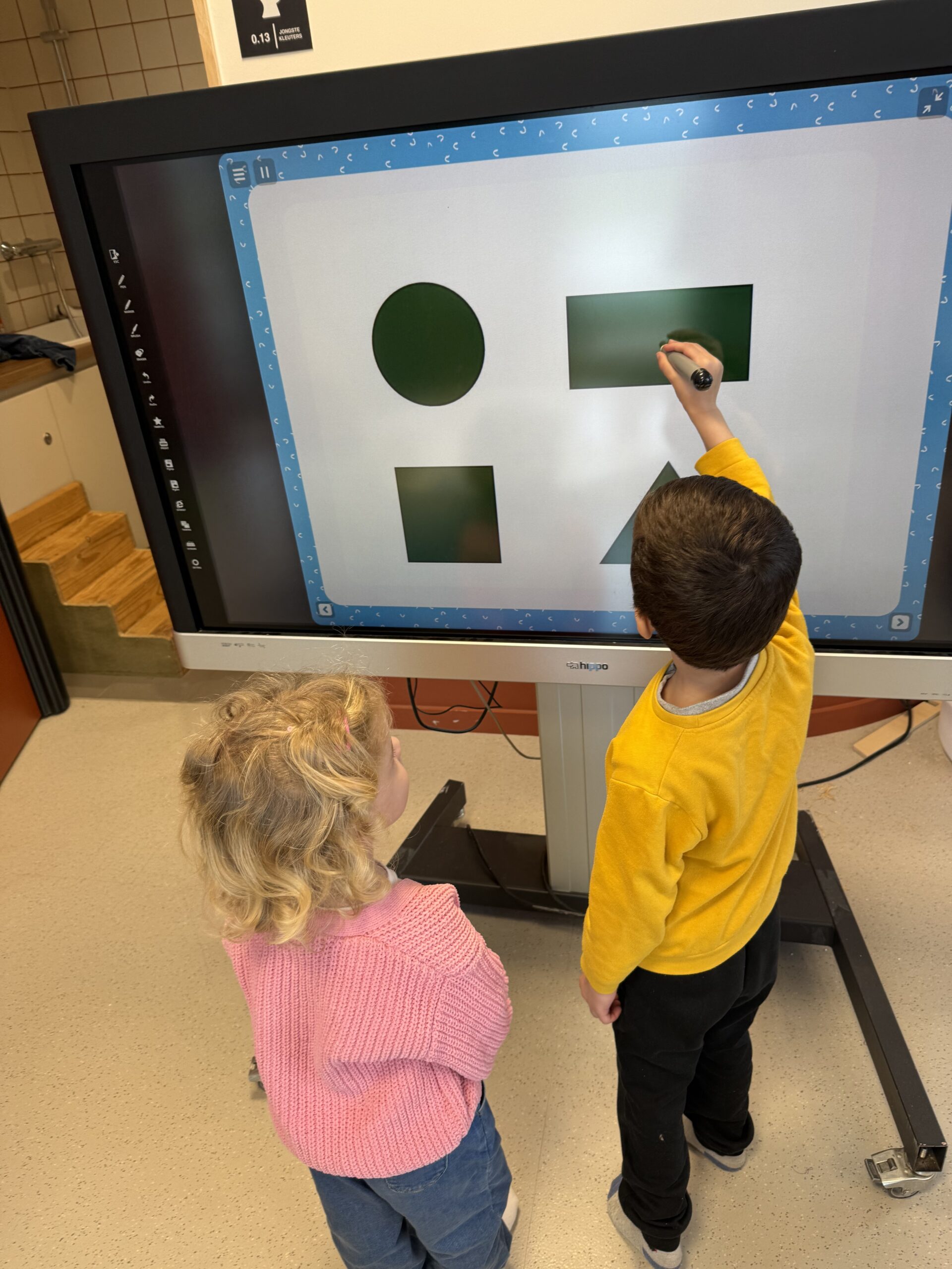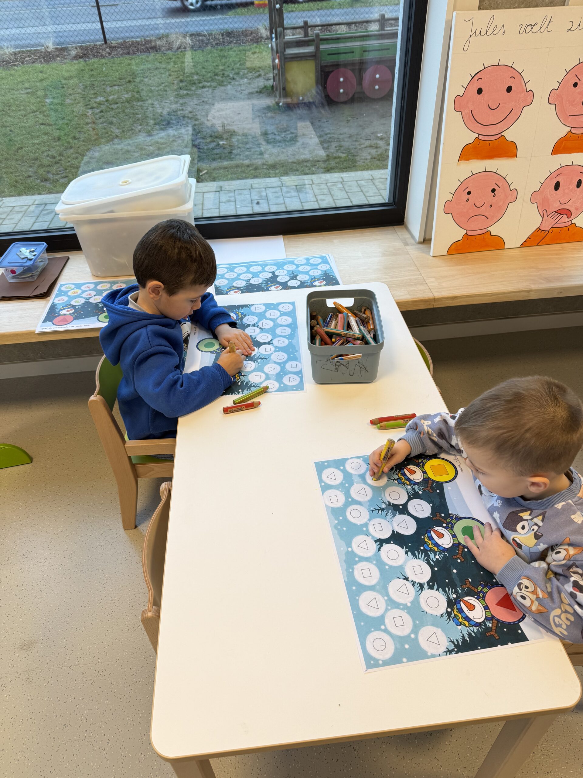 De begrippen korter, langer en even lang werden actief geoefend. De kinderen mochten een toren bouwen met sneeuwblokken die langer, korter of even lang waren als die van hun vriendje. Nadien werden deze begrippen verder ingeoefend op het grote scherm in de klas. Zo werden ook de digitale vaardigheden op een speelse manier geoefend.