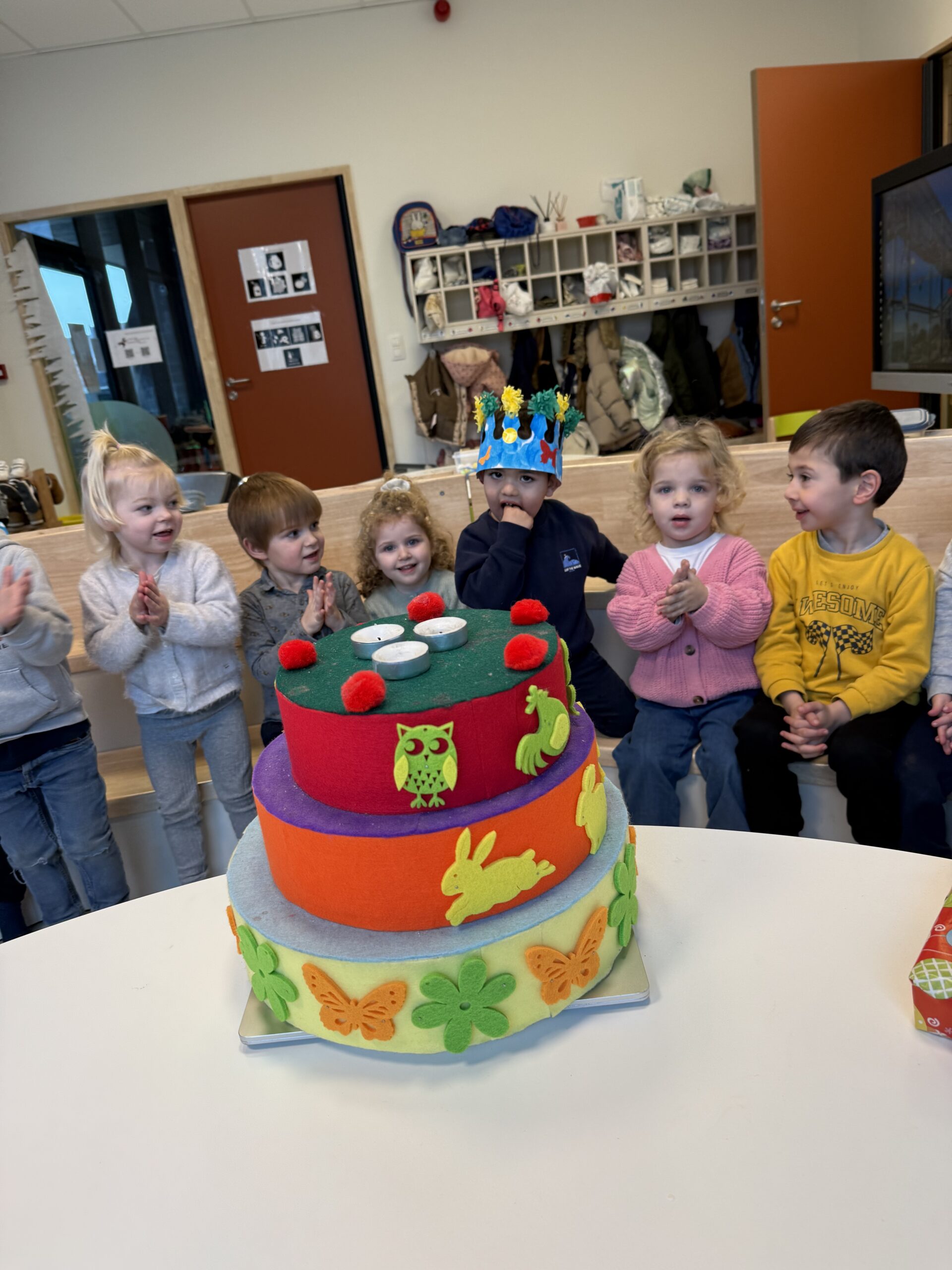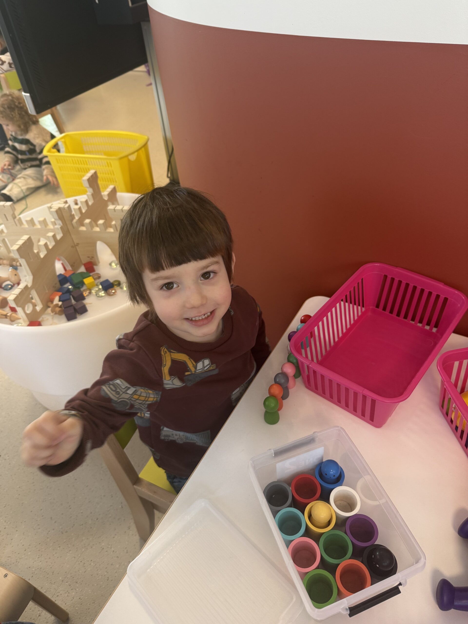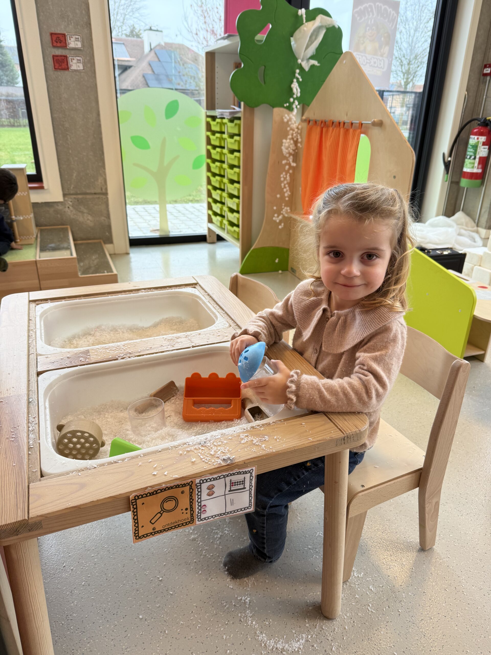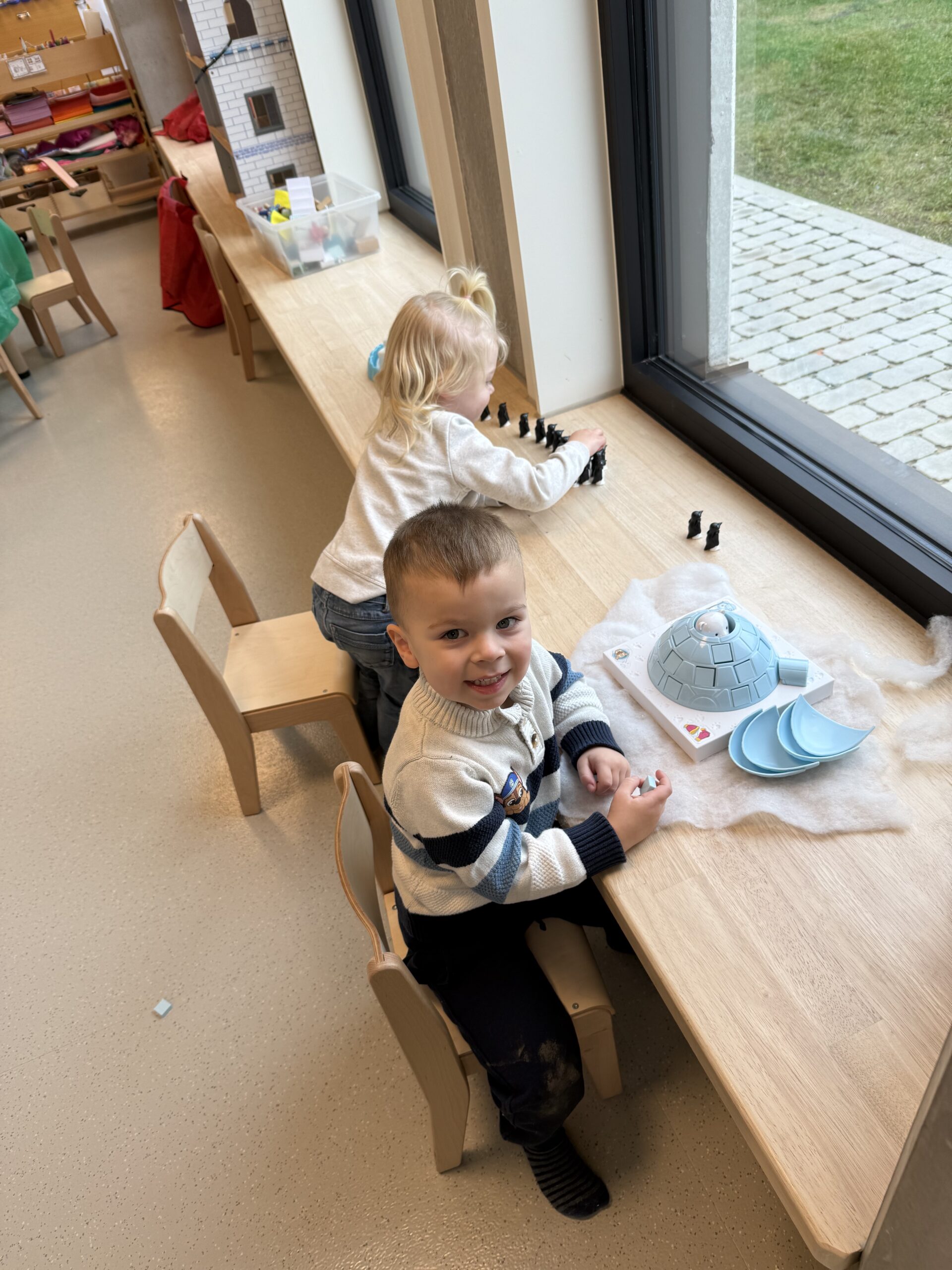 De begrippen korter, langer en even lang werden actief geoefend. De kinderen mochten een toren bouwen met sneeuwblokken die langer, korter of even lang waren als die van hun vriendje. Nadien werden deze begrippen verder ingeoefend op het grote scherm in de klas. Zo werden ook de digitale vaardigheden op een speelse manier geoefend.